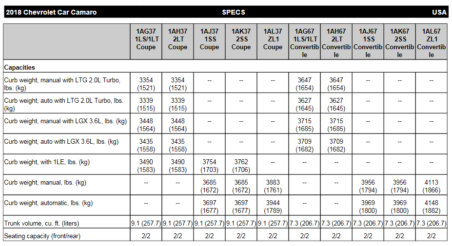 I only have this weight chart from the 2018 Chevy order book that covers trim levels and doesn't break out options apart from 1LE. Hope it helps at least a little.