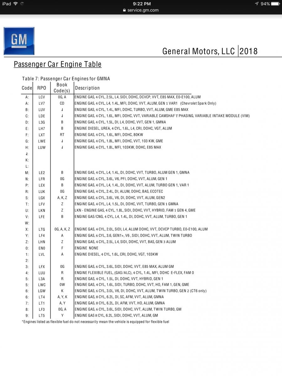 According to a Corvette news forum. In 2018 we will see a new VVT 32valve LT5 for the corvette only....so why am I posting something here? Well attached is a engine code list for GM products 2018.....I noticed that the Camaro will drop the 2.0T and the LFX 3.6...but I noticed that it will retain the LT1 and LT4 .....BUT IT'S GOING TO RECEIVE THE LF3 TT 3.6LV6!!!!!!!!