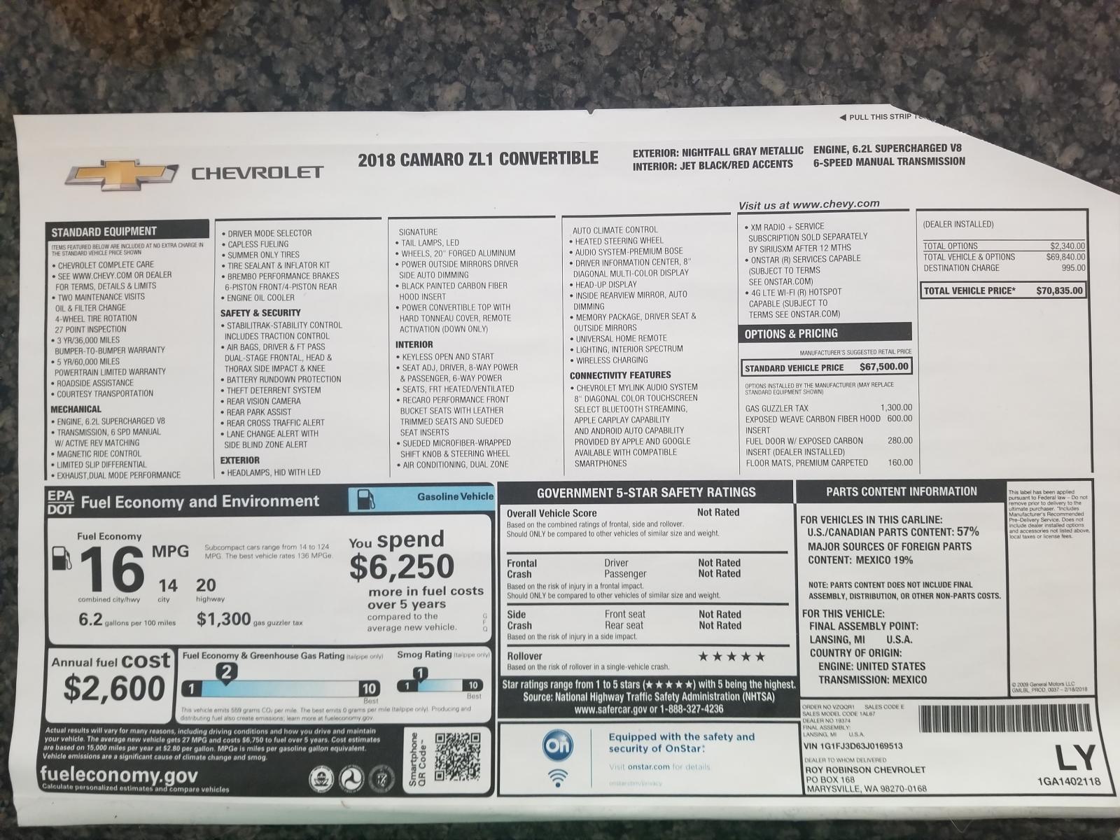 2018 Camaro ZL1 Vert M6 - 489 miles - WA State