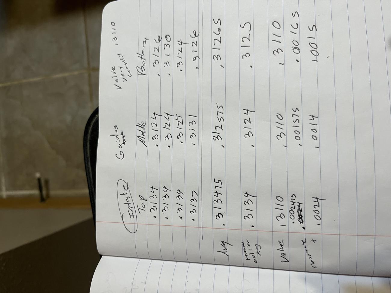 So anyhow I proceeded to begin the process to pull the Passenger side head. This went relatively smoothly and I was pleased to discover that I was able to get to the head without removing the water pump. I had bought some split ball hole gauges to try and see what I could figure out on my own before taking the head somewhere as I want to know what the deal is so badly. I hate the subjectivity of the split ball gauge and wish I had a dial bore gauge that small. I have a mitutoyo that goes down to .7” and that thing is great! I got super repeatable measurements when I was checking the tolerance of my lifter bores to lifters. It’s just so hard to know what the correct drag is when checking. Thus far I have only checked the intake and exhaust on the problem #6 cylinder. It looks like on the intake where the top portion of the guide is at least close to out of spec, (.0024) and interestingly the intake and exhaust seem to have pretty close tolerances. See pics. But!!! Here is the crazy thing I discovered. While micing my valves I very consistently was getting .3110” and a couple .3109” It hit me like a ton of bricks while I was averaging all my measurements that .3110 is not an 8mm valve. 8mm is about .315” and I did some reading and the valves themselves typically run about .313X. 5/16 equals .3125 AND many 5/16 valves are .311. So I ran an 8mm flycutting tool in a guide reamed for a 5/16 valve! Ugh! I feel so stupid. I’ve mentioned that it was tight and that was why. So this has got to be it. Again I guess I only have myself to blame as I should have checked before polishing that cutter to make it fit. All the information on the Mast website on the heads showed 8mm and I just never considered anything different. Ironically they have updated the heads since I purchased and they now actually state they run 5/16 valves. Maybe mine were some early ones before they changed the literature? I measured the Lindy tool down low by the nut and sure enough it measures .3131” where it was not ever spinning in the head. The rest of the shaft was .3115 to .3118”. Even after polishing with steel wool and spinning a ton in the guides it is still bigger than the valves. Surely this is the problem, I may need all 4 intake guides replaced but the #6 one for sure. |