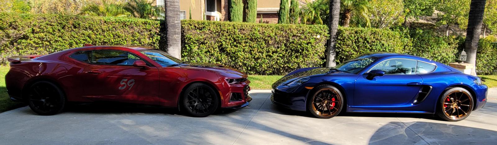 Camaro Zl1: 650 hp 650 tq, 10 speed automatic. My primary track car. GTS 4.0: Investment car and canyon carver. Not going to the track....for now. (my wife's orders!) I will rate the cars on a scale of 1-10 and then add up the points. I don't know which one will win....probably pretty even actually. An SS 1le might be a better match up vs. the GTS....I have had that car as well. But, I will stick to the Zl1 since that is the track car I have now. Overall appearance and looks: Zl1 is an 8. GTS is a 9. (mainly because I powder-coated the GTS wheels copper) Which car has a better infotainment system and standard features: Zl1 is a 9. GTS is a 5 (Chevy infotainment and standard features are really good) Which car has better seats: Zl1 is a 9. GTS is an 8. (Recaros in Camaro are awesome. GTS seats are a bit tight, but feel good as well) Which car has a better stereo: Zl1 9, GTS 7. (Bose system in Camaro is real good, GTS is not.) Which car has better fit and finish: Zl1 7, GTS 9 (110k car vs 65k car....Porsche wins) Most trunk and space for tires and suitcases etc: (Camaro 9, Porsche 7). For the size, the GTS is pretty good. Better sounding exhaust: Zl1 9, GTS 8. (Both sound really nice...different sounding v8 vs flat 6, but I like v8's better) Fun to drive: Zl1 9, GTS 10. (GTS is sublime, balanced and is probably the best feeling driver's car I have driven in a long time. Camaro is very, very good, but not quite as good) View out of the cockpit: Zl1 7, GTS 9 Bang for the buck: Zl1 10, GTS 8 Value over time: Zl1 7, GTS 10 Classy enough to go to a Orange County party?: Zl1 6, GTS 9 Total so far: Zl1 99, GTS 99 Feel free to add some categories!