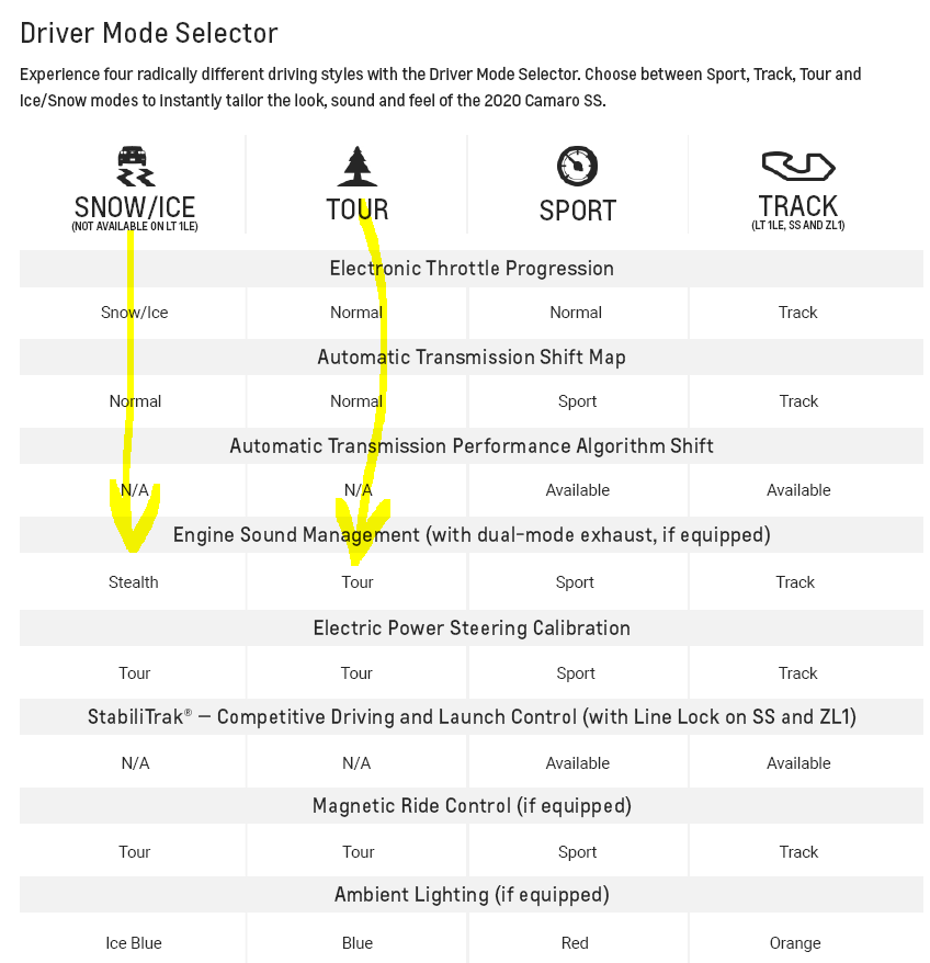 LT1 has stealth, tour, sport, and auto (follows drive mode). It does not have a track option. Stealth really quiets down cold start, which is pretty loud in tour or sport. Only catch is you have select stealth mode manually in the vehicle settings every time you want to use it.
