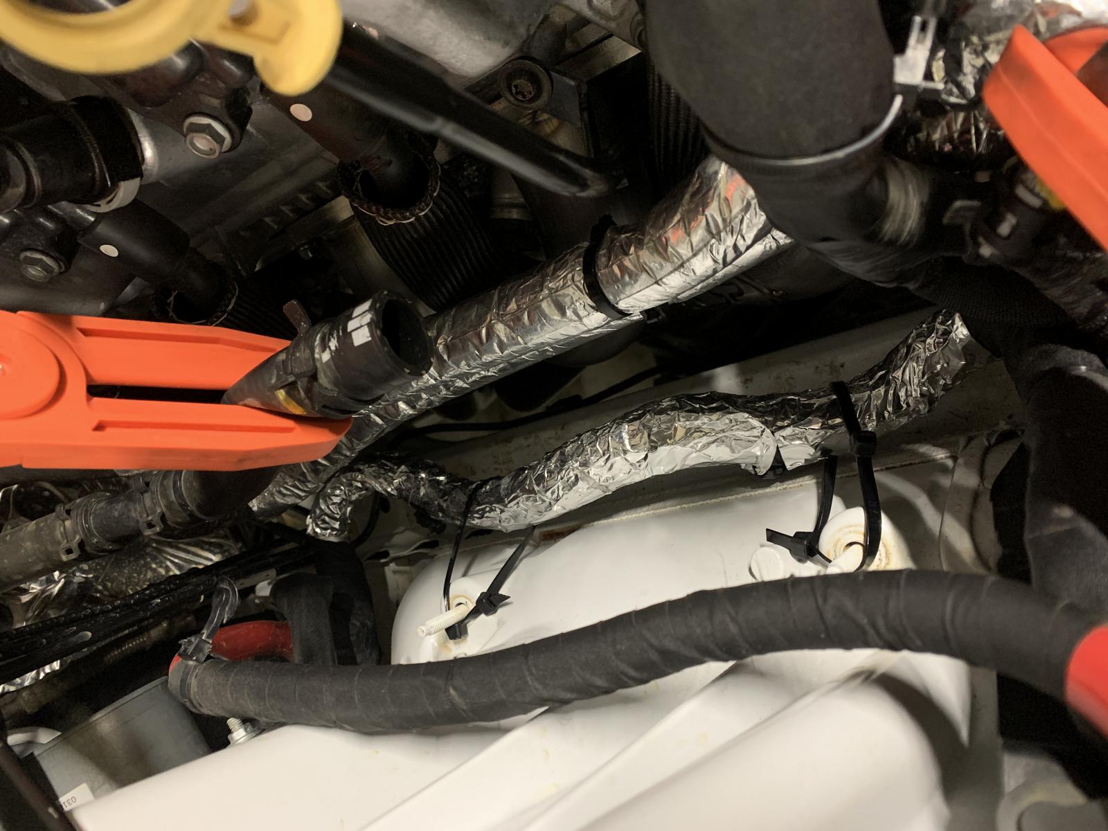 This would be my first thought as well. Look at the wiring harness that runs along the body inside the engine bay under the coolant reservoir on the passenger side. It runs VERY close to the headers. I wrapped my in heat shield and zip tied it back about 2" from where it normally lays to try and give it some breathing room from the headers. This is looking straight down where the coolant reservoir would be sitting.