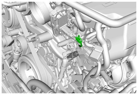 This view is with the air duct removed. Coolant sensor is #2. The connector is #1(shown unplugged). Black/white wire is signal ground. Blue wire is the signal. Check the sensor, connector and both wires.