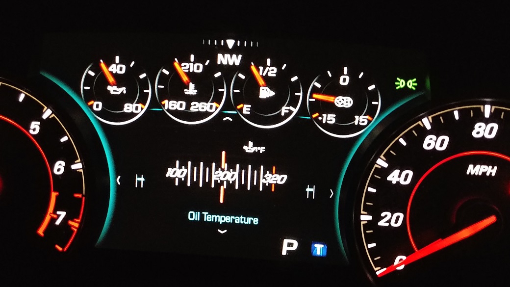 The other problem I am having is if there is too much time between runs the car cools off too much and timing is pulled and MPH drops like a stone. So I keep the hood down and need to start the car at least 5 minutes before a run and I watch the oil temp gauge. The one below is not quite there. The bar needs to split the 200. There are 10 quarts of oil in there! Others must also have this problem. Also my ZL1 is low on MPH compared to others. in -1500 DA 1/4 tank all stock I could barely touch 126. Usually I am at 122-125. ![]()