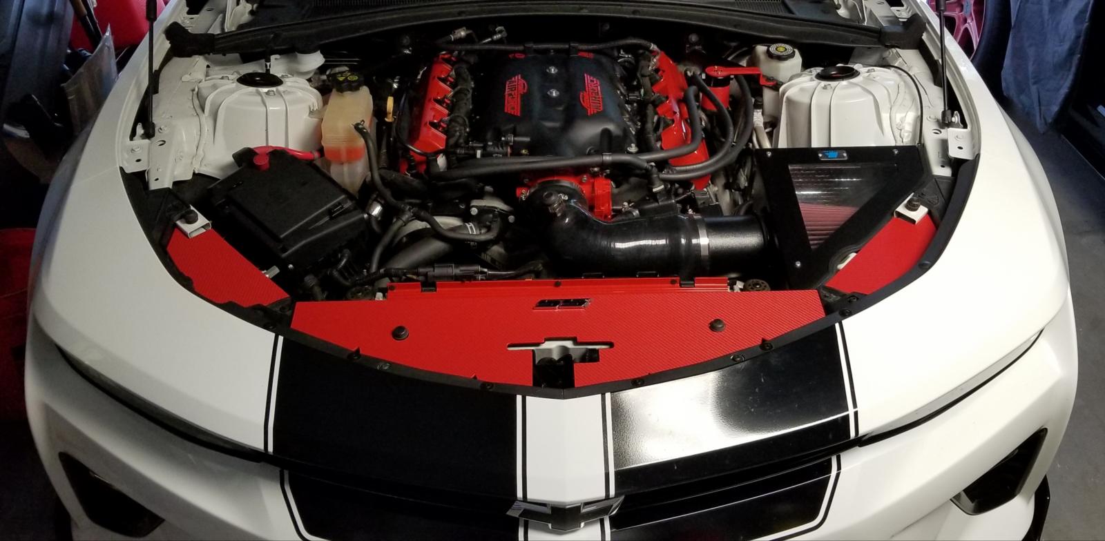 Wrapped red carbon front covers and jlt catch can.