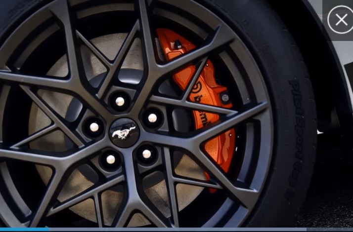 To improve ride and handling, Mach 1 features the latest MagneRide calibration, a stiffer steering I-shaft, new EPAS calibration, stiffer sway bars and front springs, a brake booster from the Mustang GT Performance Pack Level 2, 9.5-inch/10-inch split fitment wheels with Michelin PS4 tires, a rear subframe with stiffer bushings and a rear toe-link from Shelby GT500. That's the "base car". I looked at some B-roll footage of the Handling Pack version and caught a still of the front tire. Cup 2.