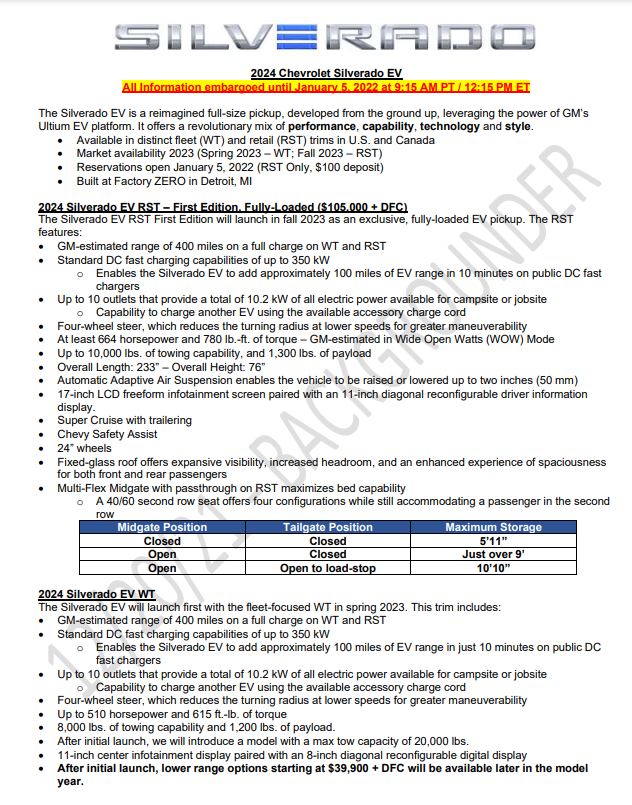 In spring 2023, the Silverado EV will debut a WT model offering GM’s longest range battery with an expected GM-estimated range of over 400 miles on a full charge. In fall 2023, a fully loaded RST First Edition model, also delivering a 400-mile range, will debut with an MSRP of $105,000 + DFC. After production ramps up, Chevrolet will unleash the full Silverado EV portfolio, including WT (with a starting at MSRP of $39,900 + DFC), RST, Trail Boss and more. Customers will have the ability to content the truck across various price ranges, with MSRPs around $50,000, $60,000, $70,000, $80,000 and more, allowing them to choose the truck that meets their capability and pricing needs. It looks like perhaps the Silverado options and combos will be more plentiful than the pre-packaged Hummers. Still not very specific with pricing and details, but maybe more chances to personalize the Silverado. |