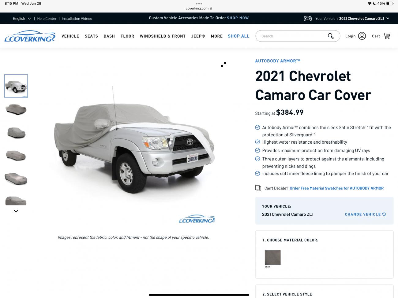 Coverking's Autobody Armor offers maximum protection for both indoor and outdoor use. This custom car cover features three layers of fabric to create a strong barrier against water, UV rays, dirt, dust, animal droppings, and pollutants. All fabrics are made from breathable materials to eliminate condensation under the cover. To further protect the finish of your car, we've added a soft fleece liner for a gentle enclosure around your vehicle. As with all Coverking covers, Autobody Armor is manufactured to the exact specifications of your vehicle with mirror and antenna pockets included where applicable (check your option description for specific details). This custom cover will fit your vehicle like a glove. Three layers of material for maximum protection Outer layer of woven polyester for maximum protection Durable inner polyurethane layer for maximum water resistance Soft inner lining to protect the finish of your vehicle Highest level of UV protection and water resistance Custom-fit styling to the exact specifications of your vehicle Special neoprene elastic tensioners in front and rear to hold the cover firmly in place Includes covered grommets for use with optional cable and lock kit Mirror and antenna pockets included where applicable (check option text for details) Manufactured using Coverking's unique double-stitching and waxed thread technique to virtually eliminate leaks |