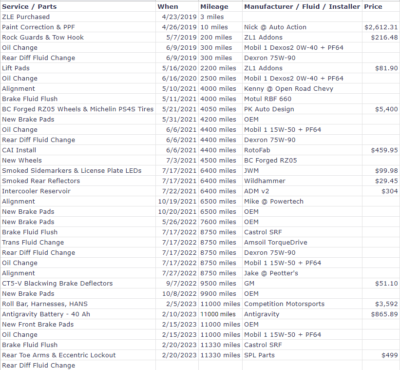 One sheet is essentially a service & mod log. Another sheet has part numbers & prices (mostly brake related). Not shown here, but I also have a sheet with some common torque specs and another sheet which is an HPDE log to keep track of my events.