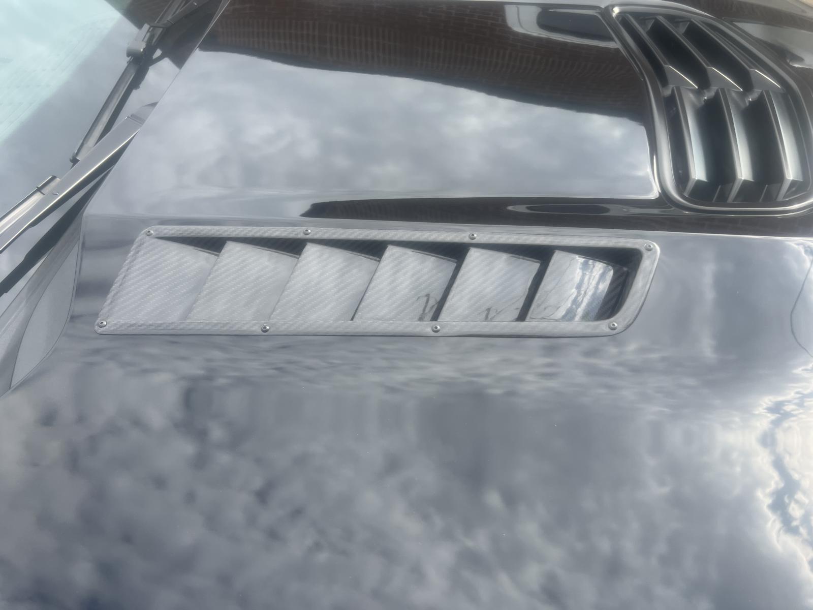 These pics show the install in progress. Typically you lay out some painters tape on the hood and then precisely draw out the cut lines and then cut the OUTSIDE part of the hood FIRST. It would be nice if APR Performance would have included a cutout template but they dont!!! I will take another set or pics once these are installed. The finish quality on this APR part is very good and these cost roughly 375 dollars. They are attached with some very small stainless steel buttonhead bolts (included). There are 8 bolts per vent.