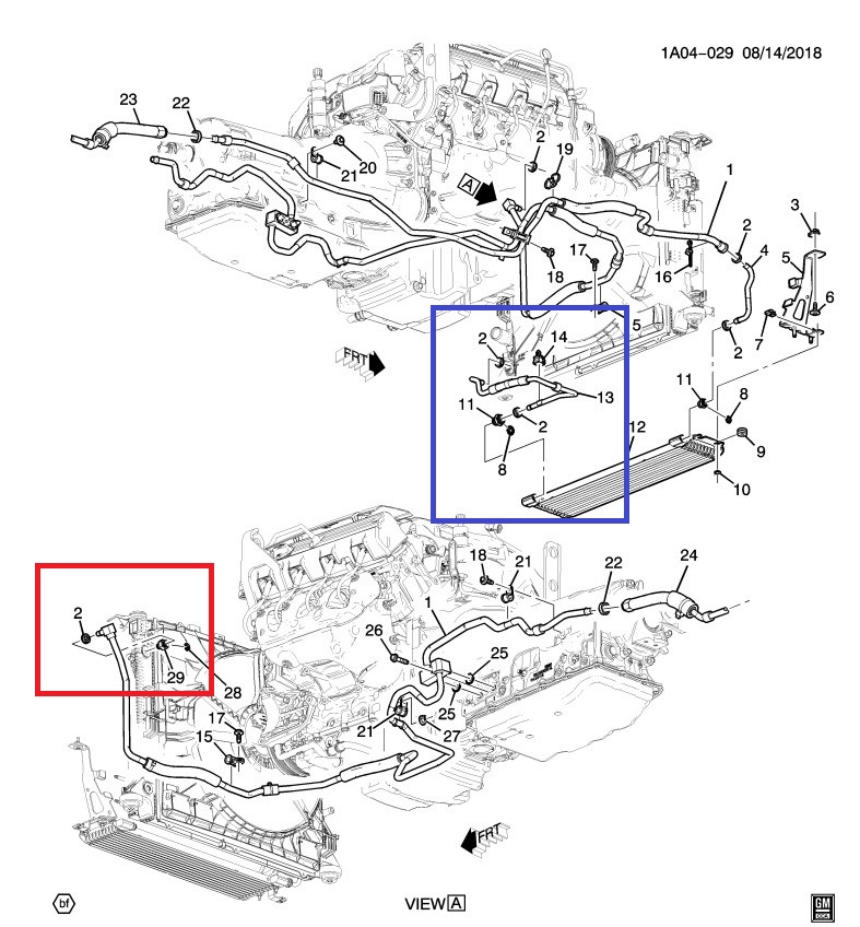 Within the blue box, pipe 13 connects the aux (plate) cooler to the bottom of the radiator. This connection is not shown in "View A" but it is clear in the upper view. GM does this on their diagrams to not muddy the waters.