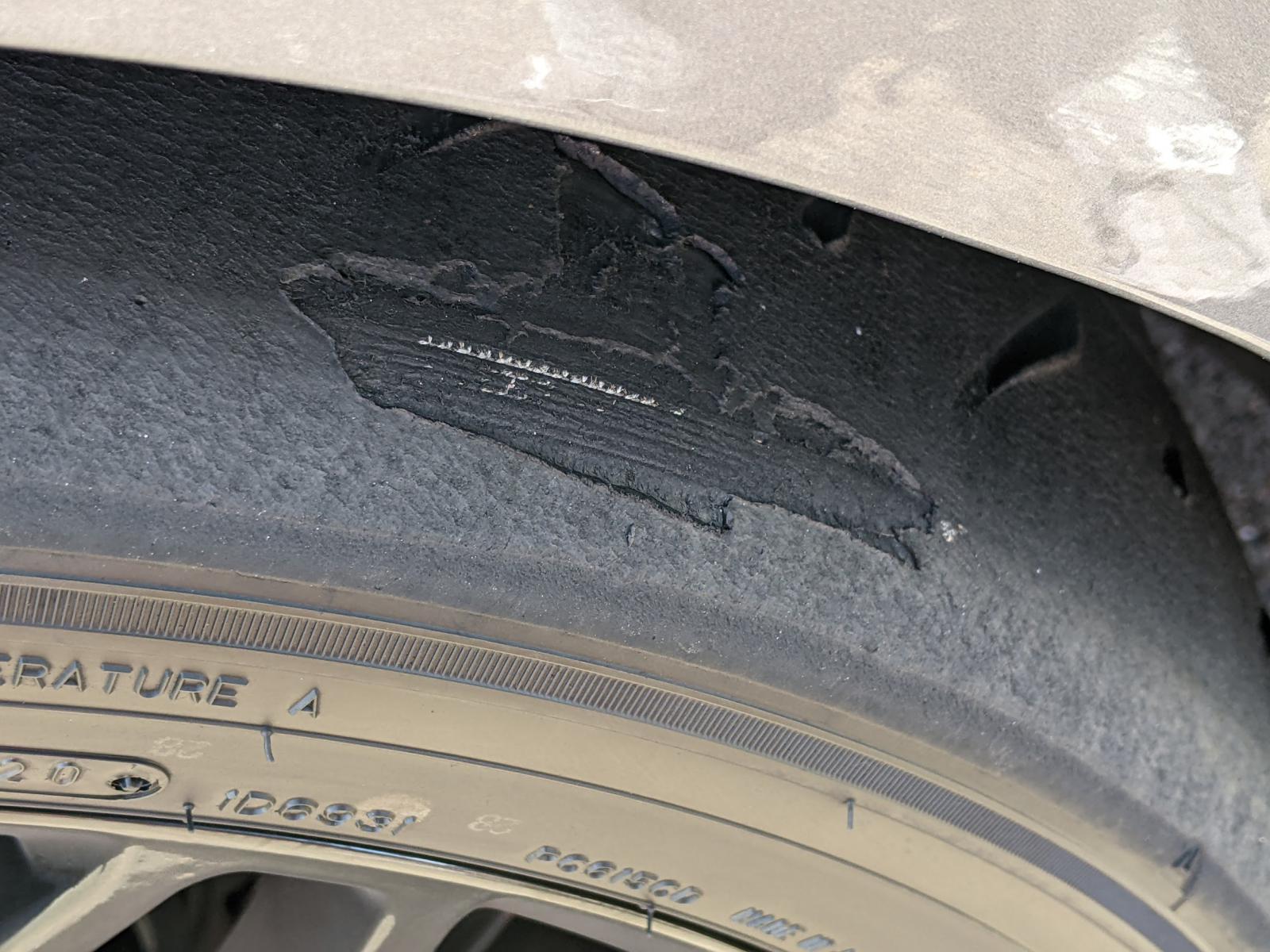 Here's a view of the outside shoulder of when my Falkens were finished. There were several patches like this. I felt like they were still fast right up until they fell apart, but my improvement going to SC3 showed otherwise. Not buying the Falkens again.