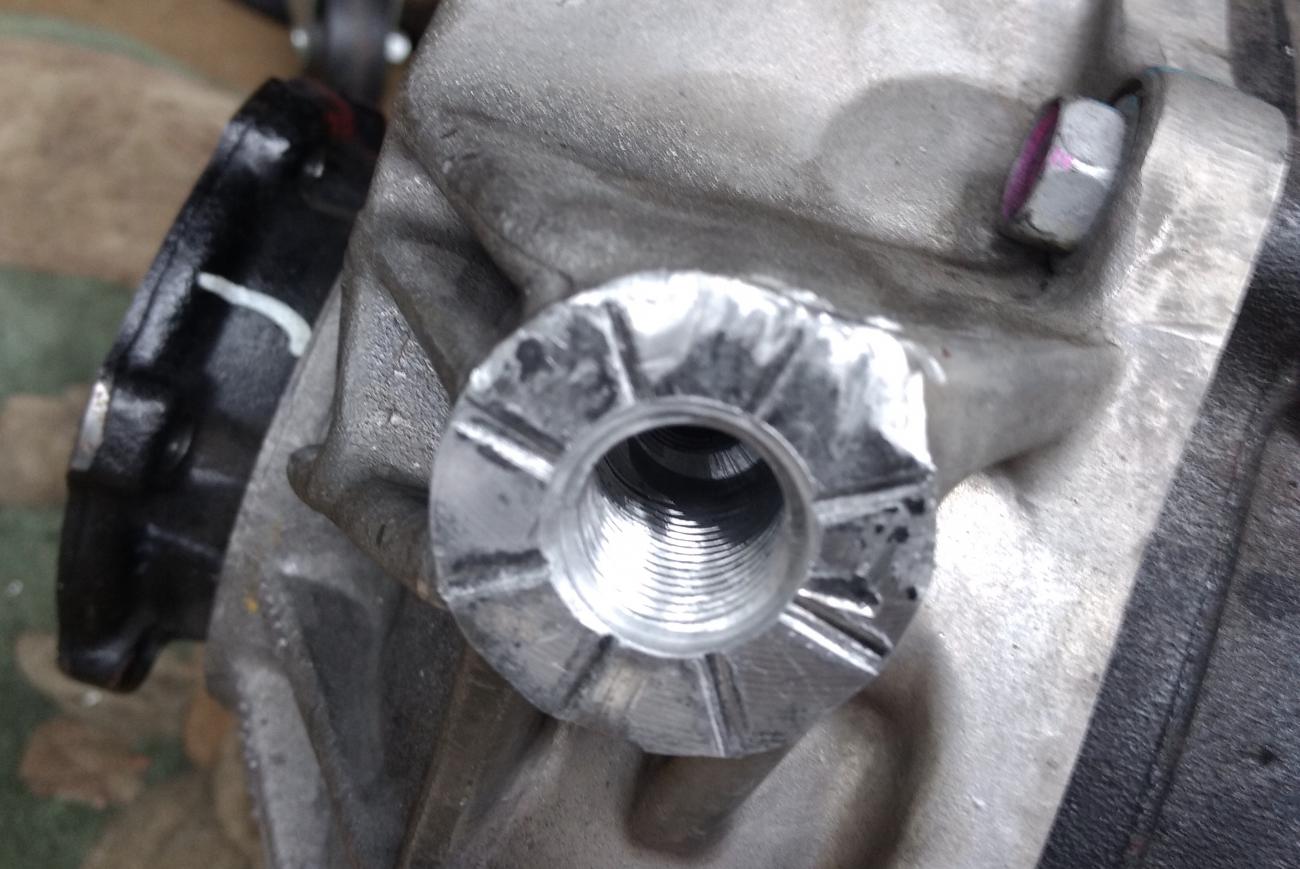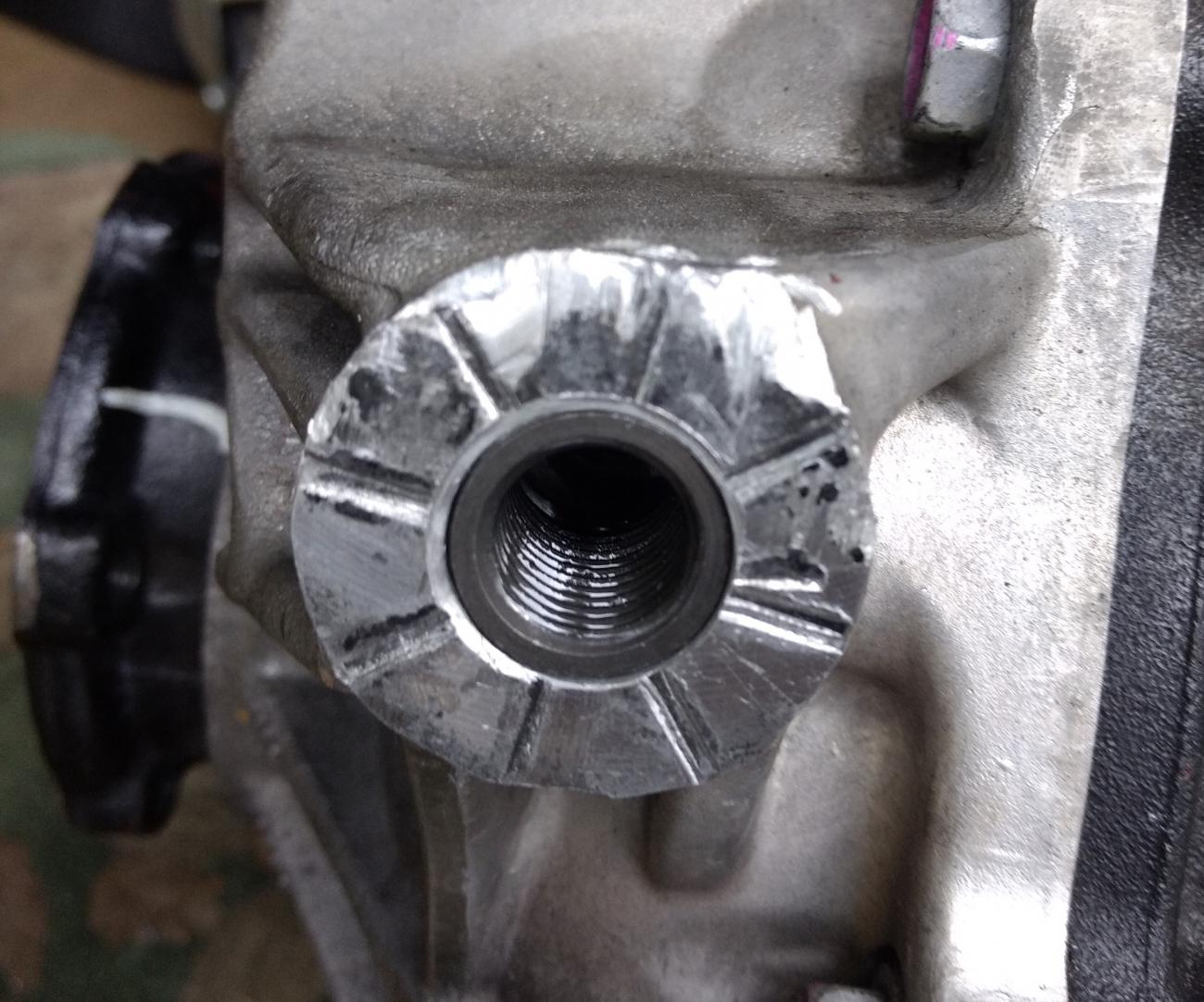 probably wondering why I removed the differential...the top bolt broke on track about 6 months ago and the track service "fixed" it. In the process, they stripped the aluminum housing on the top bolt so I am going to install a thread insert. No way to do this without dropping the entire center section. Pics are ugly. I knew something was wrong because there was a persistent clunk which was metal on metal and very aggravating.