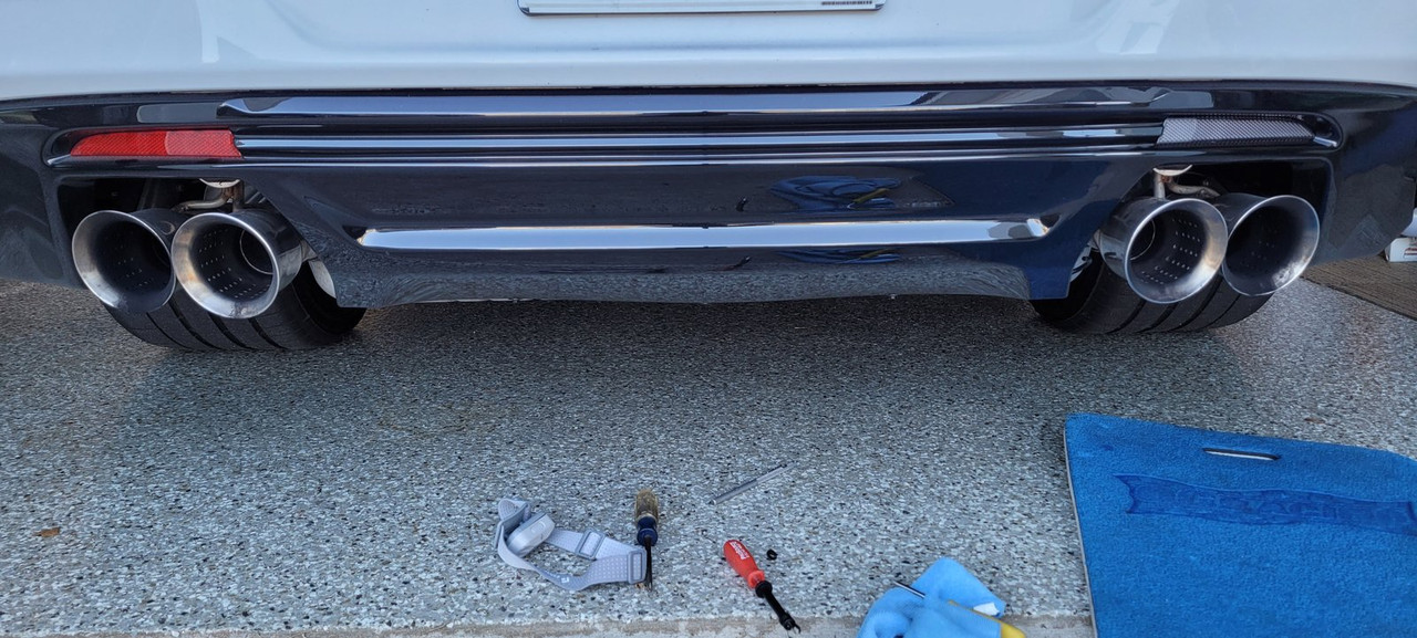Patience is a virtue for this "apparently innocuous" easy procedure. This is mainly a blind, feel and touch procedure. First thing is run the screws into the new reflectors where the plastic screw receptacle is to get a good internal thread started. This will make the task of blindly attaching and tightening the screw easier later. Aim a flash light at the area where you will put a small Phillips screw driver (preferably magnetized) into the black abyss and attempt to extract the small OEM screw. If you are lucky after many tries to get the little tip into the screw and slowly, delicately, gently un-screw the fastener. You will drop it inside and must retrieve it with a slender pen magnet. The red reflector comes out easily. I used the OEM screw (kind of mistake) which has a built-in washer versus the supplied screw which is shorter and a separate washer. Put a small orientation screw driver from the outside in to find the area first where you want to put the screw in from the inside. My screw driver was magnetized enough to hold the screw while I attempted to put it in a tiny hole that you cannot see. This is the most frustrating part. Once obtained the area where you will feed in the screw, pull out the orientation screw driver from the outside. Put your finger in that same hole area while you feed the screw from inside. Eventually you will feel the point of the screw with your other hand/finger outside. With that same outside hand place the new reflector in and try to start the screw to bite into the plastic hole. Accomplishing this task is a great relief. Tighten gently the screw carefully as not to risk the screw driver falling off the screw. Maybe 20 minutes of frustration. One down, one more to go. I did the other side the same way, but for some reason I could not completely tighten the OEM screw (reflector was to lose) and wasted a lot of time. Took a break then went back creeping under the car to start all over. Removed the new reflector and decided to use the smaller screw/washer provided. These screws are shorter, hence easier to apply and overall better (guess that is why they included them). Next my magnetized Phillip screw driver went limp and would not pick up the screw. I resorted to blue painter’s tape wrapped around the tip and the screw/washer to hold them in place. This time luck was on my side and I was able to remove and replace quickly in five- or ten-minutes total. What a fun project and a challenging surprise, but totally worth the outcome. I think the rear end looks so much better. ![]()