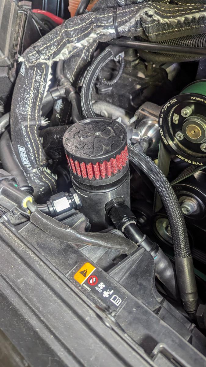 you can hook the valley plate adapter or spare valve cover port(s) to one or both of the outer ports on the stock black box, since it appears the exit of it is still connected to the cold air intake you can also unhook the lines at the valve cover and blow toward the can this should be very easy to blow, and may find a restriction somewhere perhaps also double check the fittings in the valve covers for not necking down on the hose size if the valve cover fittings are -10 port, we can go up to full flow -12 with our parts
