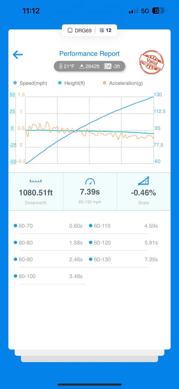 How’s this for comparison? Stock tune, A10 ‘21 ZL1. Only mods are K&N carbon fiber intake and Tony Mamo ported oem throttle body. I also put octane booster to 95 octane to prevent pulling timing above 110 mph. I noticed on previous runs with 91 or 92 octane the top end really suffers. Full weight, too. And spinning on the hit also—notice 0.80 sec 60-70. Without spin that is usually 0.70 to 0.72.