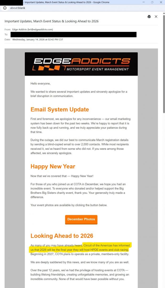 Got word from one HPDE group: As many of you may have already heard, Circuit of the Americas has informed us that 2026 will be the final year they will host HPDE events and club racing. Beginning in 2027, COTA plans to operate as a private, members-only facility.