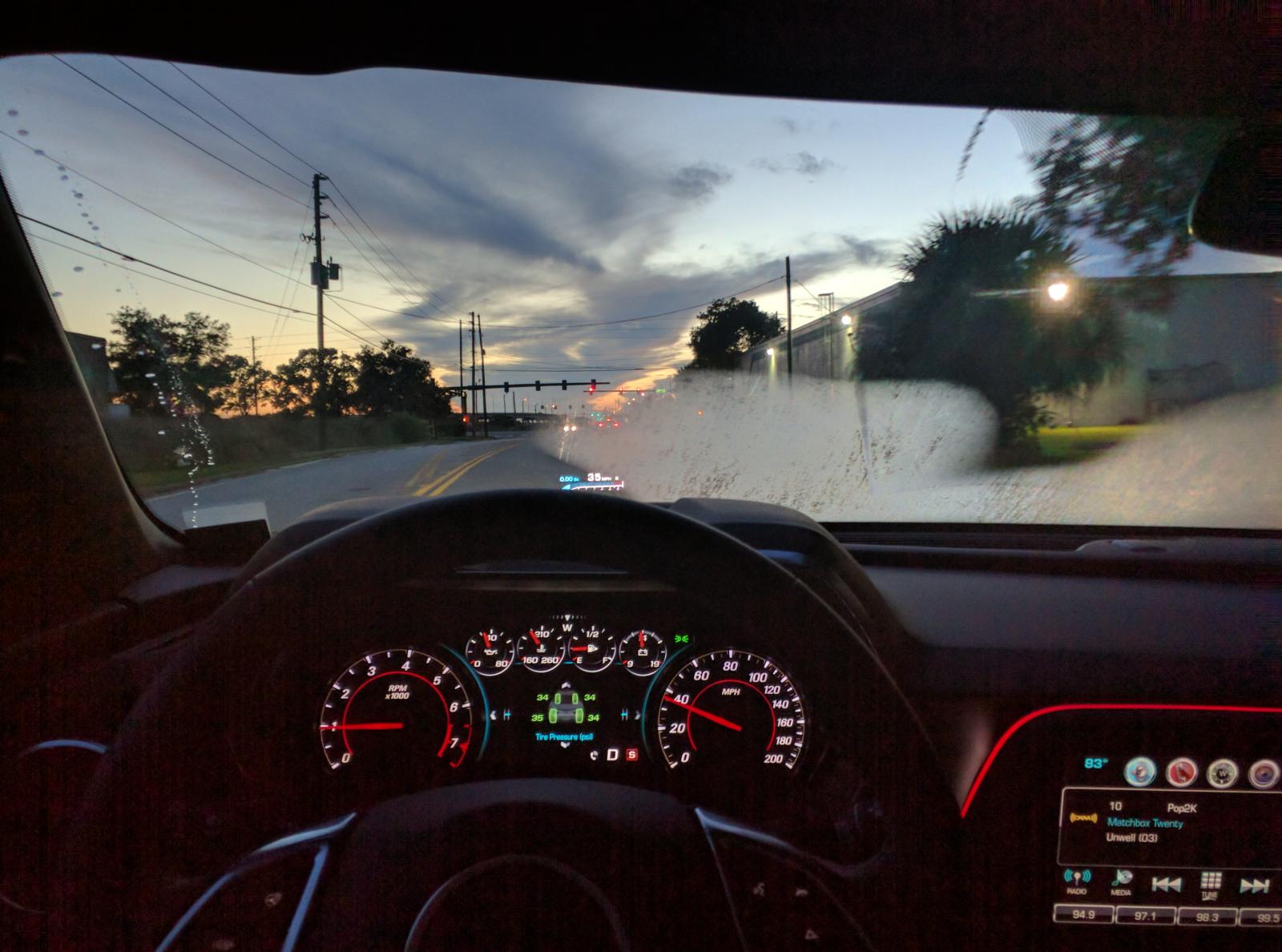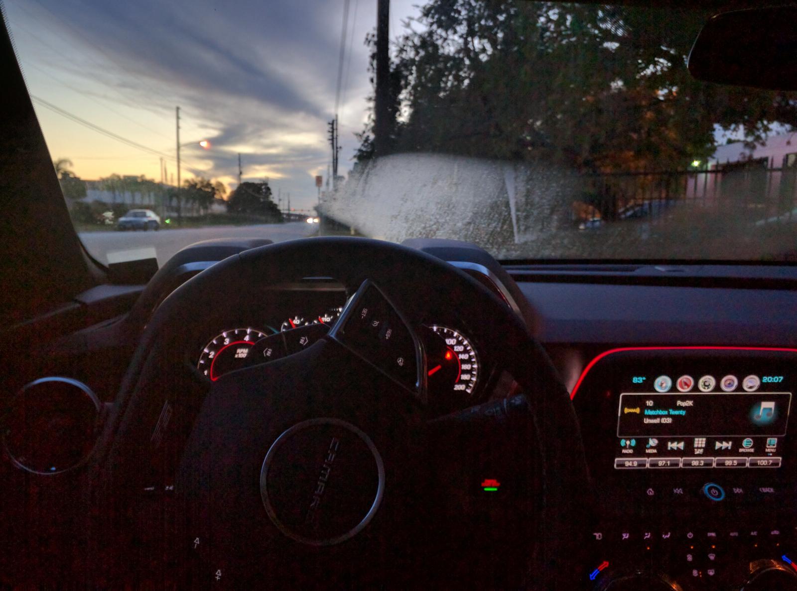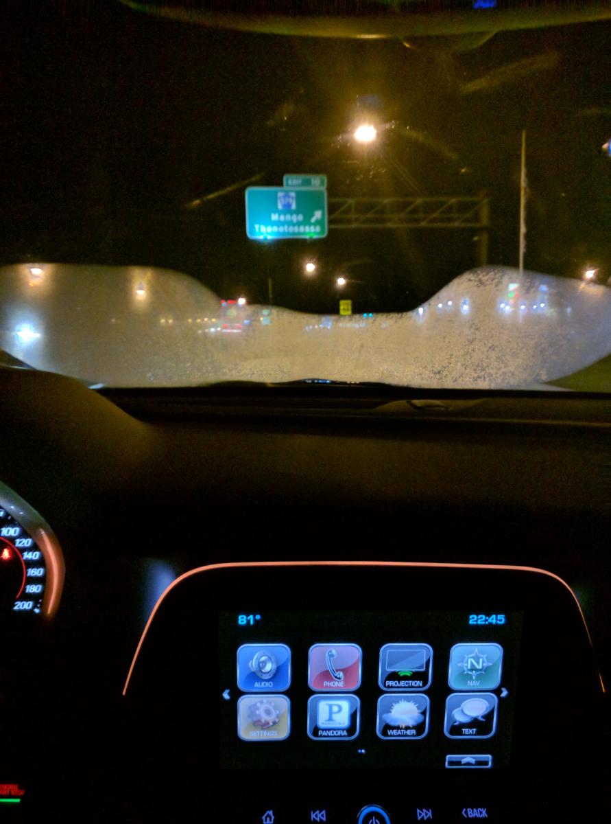 Photos are 18 seconds apart, after wiping the windshield. We got off the highway to stick a towel on the glass after that because it was so opaque. I never used my wipers in my 2013 Camaro. Never fogged and rain rolled up and over once I hit 41mph. Using wipers with no rain is just the insane opposite. |