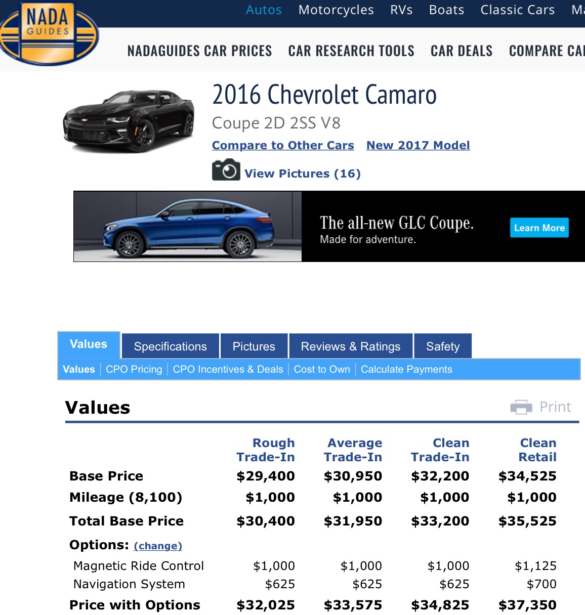 This is what I find for what I have as a 2SS, mag-ride, Nav with 8,100 mile. I've never had a problem getting NADA value for a car.