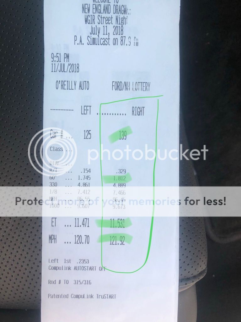 Tires used on the pass:MT Street S/S radial 305/18, stock SS fronts Performance Mods: nitrous express wet kit with 100hp jets (actually has a .028 fuel since i did not have the .027 fuel it called for on the 100hp) stock tuning w/6510 plugs .028 gap, stock exhaust, air box mod w/green filter Category submitted for: #5 R/T.......... .329 60'............. 1.812 330'........... 4.889 660'........... 7.466 660’ mph... 96.45 1000'.......... 9.673 1320'.......... 11.531 1320’ mph… 121.92 Name of the track: New England Dragway DA 867 Date of pass: 7/11/2018 ![]() https://youtu.be/nJQDC3qht8c