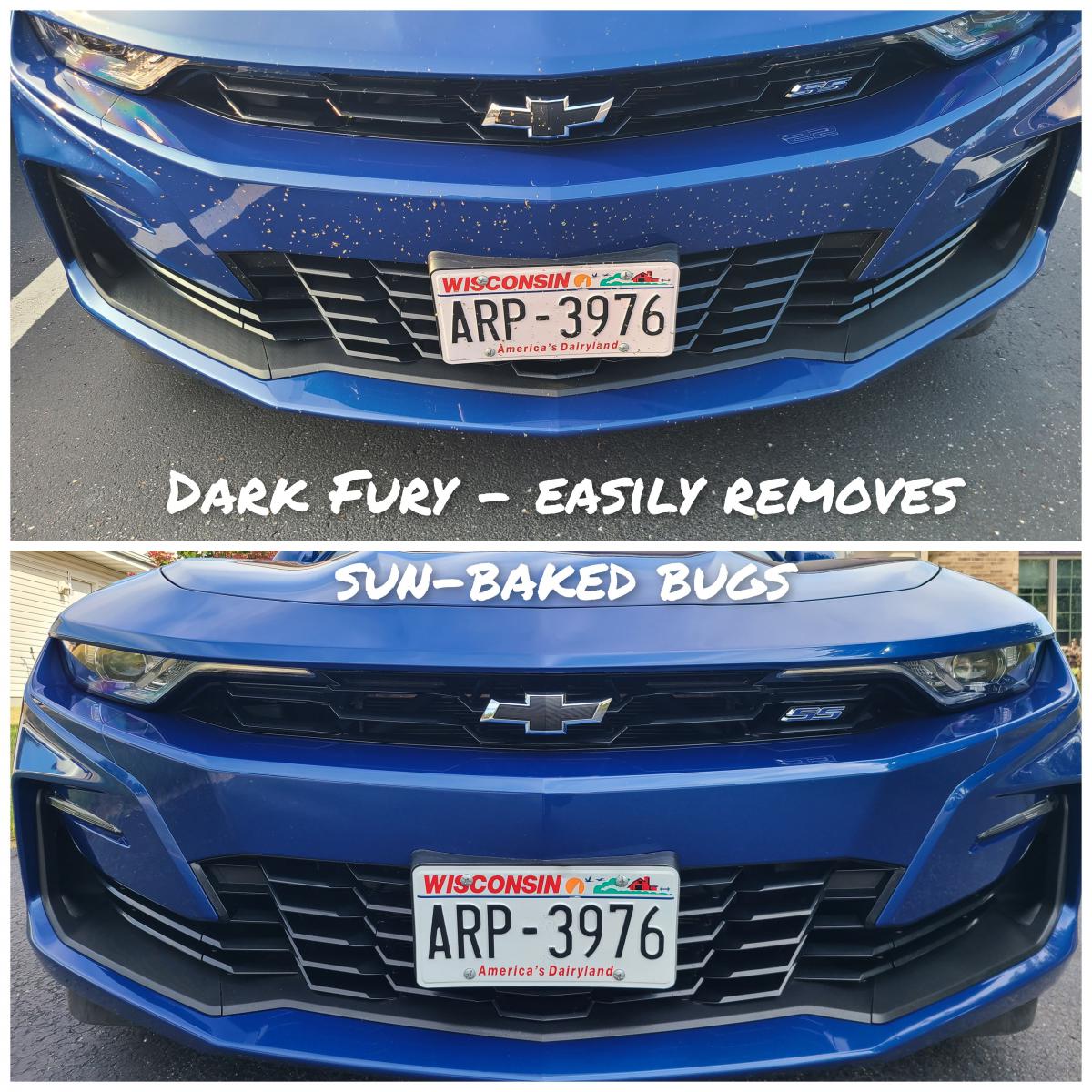 Cleaned off the bugs, which had baking for almost a week in the hot sun. Superior Products Dark Fury works great.