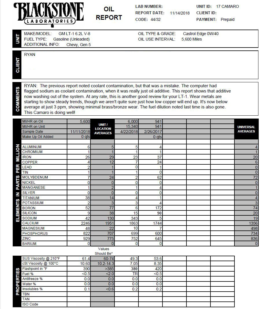 *941 miles is the factory fill *6k interval at 15k miles is actually the 3rd fill, used over winter '17/'18. It's Valvoline SynPower 0W-20 Dexos1 Gen2. This lower viscosity is for winter/street-only driving. *5,600 interval is the most recent, at 21k odometer. It's Castrol Edge 0W-40 A3/B4, a high SAPS package. Perfect for track days. The wear metals are stable, so it's fair to say the engine is broken-in. I'm disappointed in the Valvoline sodium-based additive package and low flashpoint. The Castrol is on-point with it's higher additive package. I am also impressed with the factory fill flashpoint. The car currently has Pennzoil Platinum 5W-30 Dexos1 Gen2 in it for this winter, and then I'll likely go back to the Castrol 0W-40 A3/B4 in spring for next track season.