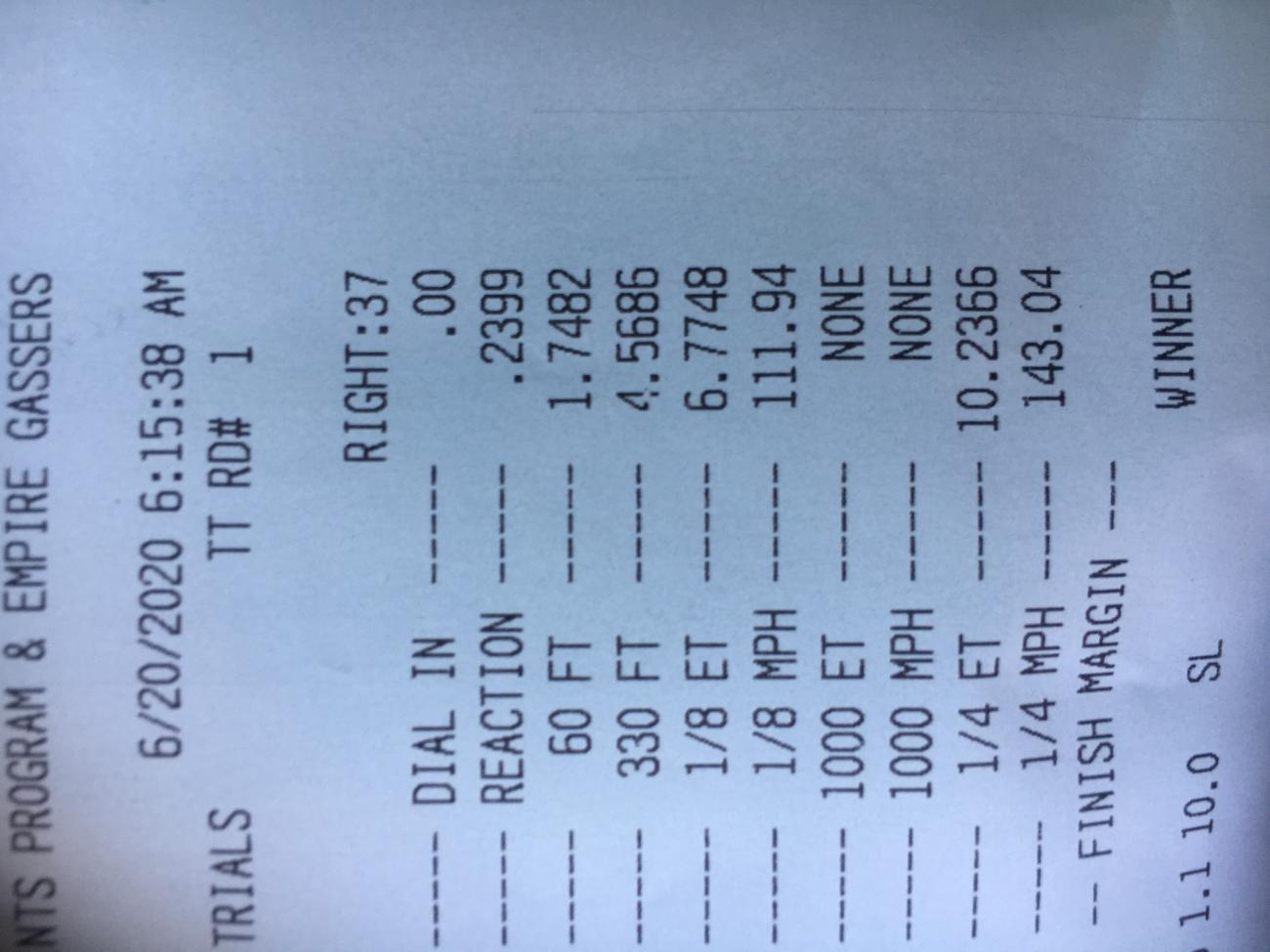 Mods...GMPP Hot cam, 2" longtubes and flex fuel Category...4 RT....780 60...1.770 330...5.057 660...7.760 660 MPH.. 92.45 1000...10.053 1320...11.984 1320 MPH...117.37 TRACK...Great Lakes Dragway Date...7.2.20 Stick car |