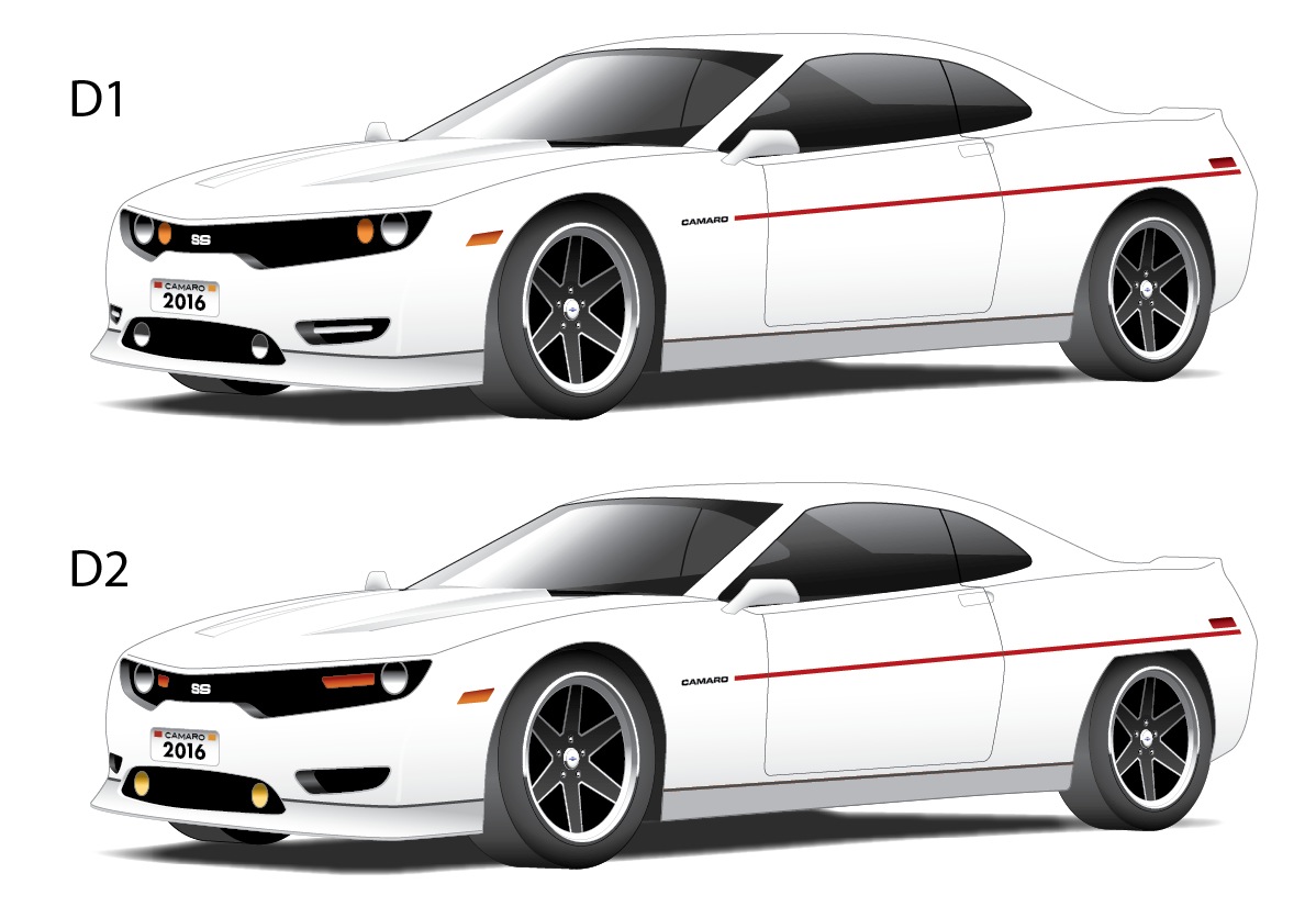 Getting down to cleaner and simpler. Got the perspective views of the new wheels done. For these two I actually lowered the top rear fender to smooth out the transition from front to back; going for the NASA/fighter jet look. On view D1 I put the arch back in the rear wheel well and moved up the side marker lights, CAMARO and red accent line appropriately. I also took out the front running light bars in the grill and made them round.