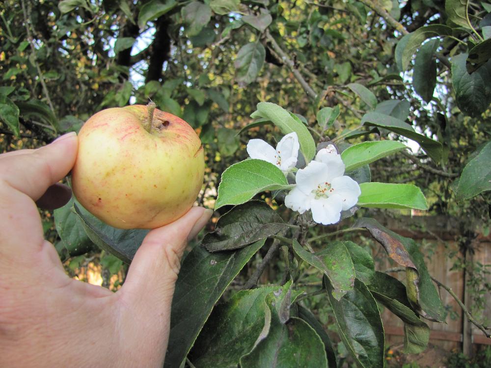 Thanks, Gary!! I did a quick Google search on twice blooming apple trees. There's some stuff about crabapples - is that what your apple tree is?? What I could find out is that the second blooms end up wasted - they won't produce fruit now, and won't bloom next spring to produce it then, either. Which is probably OK in your case - seeing apples on the ground, looks like you've got more than you need anyway! I finally caught up on sleep. Coco needed out at 5am, so I took her out, then put her in her pen in the garage with her breakfast and went back to sleep - I just got up at 10am!!! Now, just waiting for the rain to stop so Ladybug can have a bath so she'll look pretty to go to the PNWCC meeting. See you there, Gary??