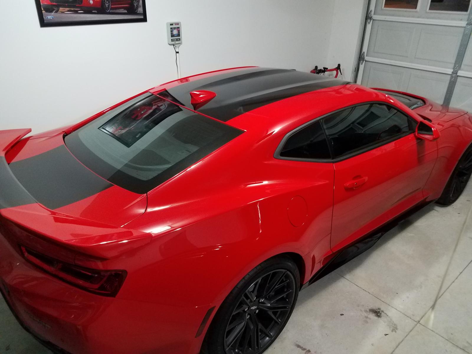 Picked up my ZL1 a on 5/13. Traded my 2016 Challenger Hellcat 634 miles away near Miami. I'll probably never drive that far for a car again, but this car is worth it and the dealership experience was awesome. The dealer was Keith Pierson Chevrolet. They gave all applicable discounts and gave too dollar for my trade, without any funny business with my numbers. They did try at first, but when they realized I wasn't a rookie they dealt straight. I love what's going on with American cars now. I have nothing negative to say about the Hellcat as far as its performance. It does exactly what it was intended to do. That being said, I feel the ZL1 is just about the best car that can be bought in this price range, so the Cat had to go. Plus, it looks much better in my opinion. The Hellcat is beefy and muscle car looking, but it's nowhere near as striking as the ZL1 is to me . Well, here are a few pics. I was kinda bummed about missing the exposed cf hood at 1st, but I love the stripe on race red now. Oh yeah, I was a victim of the black start button. Oddly, it starts the car just the same, lol. All kidding aside, I actually think it matches the interior better and prefer it to the silver one. Props to my paint protection installer. He gives every customer a photo shoot when he's done. Auto Shield in Columbia, SC.