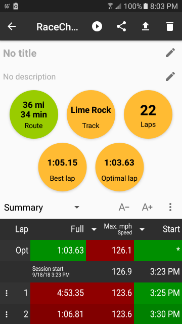 To use it, open the app and press the big Start button. It prompts you to select a track from the library, and assuming you're already at the track, it will default the pick for you. Then just secure the phone and go. Besides showing lap times and maximum speed (English or Metric), it breaks the track into sectors, captures your best time for each one, and calculates your optimal lap. Fun! Screenshots:
