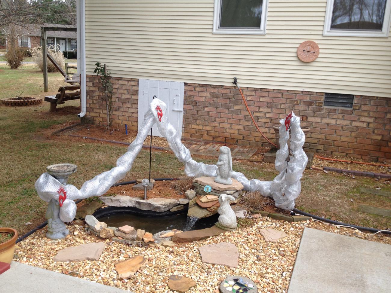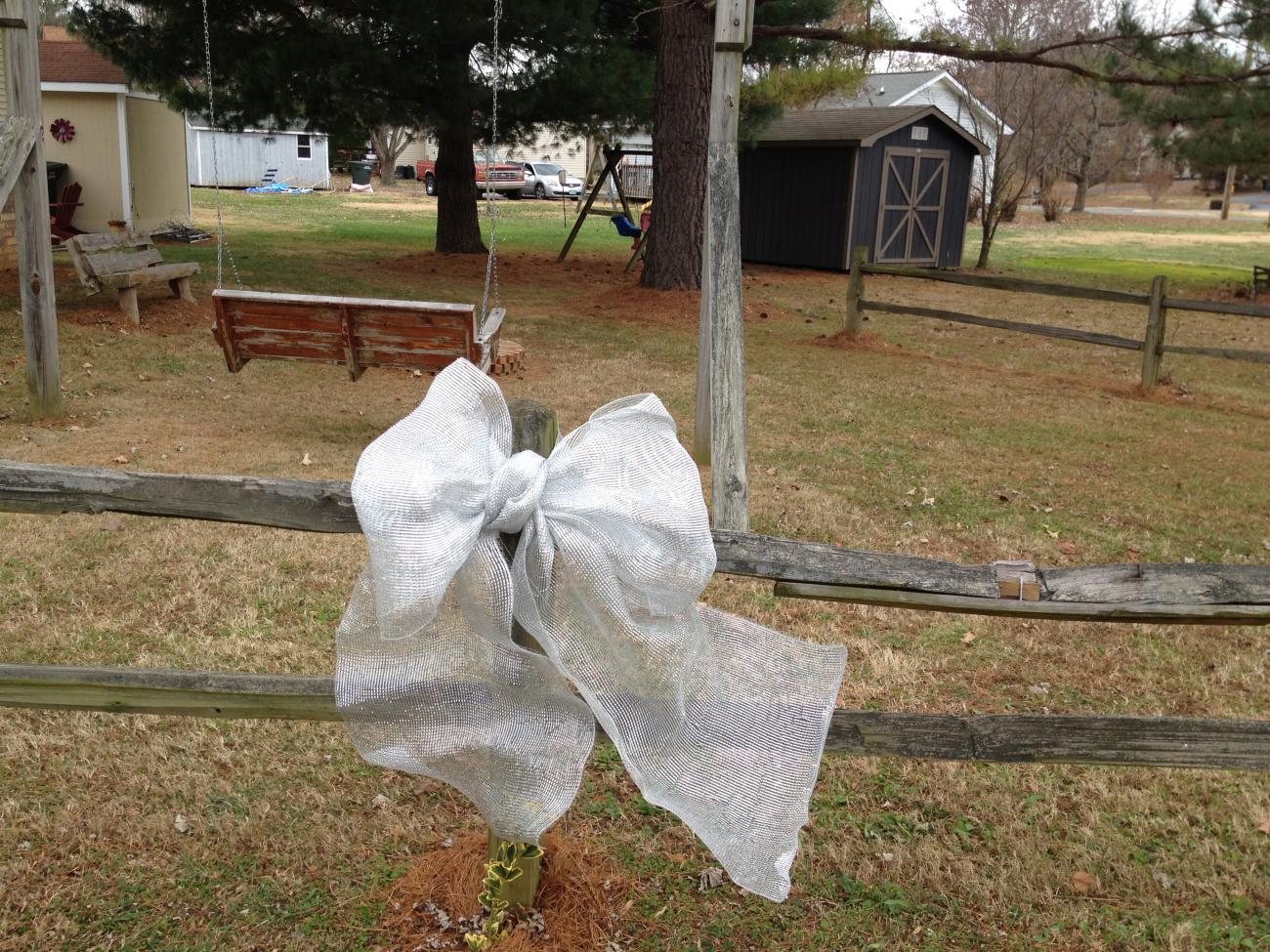 I did some more decorating today, washed & desalinated Pepper & then we took both Camaros out for a nice cruise. We had to put a cage around the tree to keep Ruby away. We could not sit down for 10 seconds in peace. I spruced up my lackluster door wreath with some strung cherries & a new bow. I finished the pond décor & made a bow & put it on the front fence. Here are a few pics from today's handiwork & outing. It was a very nice day.
