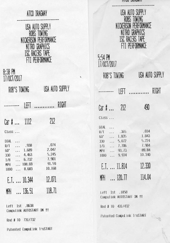 How's that for consistency? Sigh. Run #1 had good 60' with sloppy shifting. Run #2 was a lousy 60' with spot on shifting. If I could put the best of those 2 runs together, 11s easy, maybe even a high 11.8.