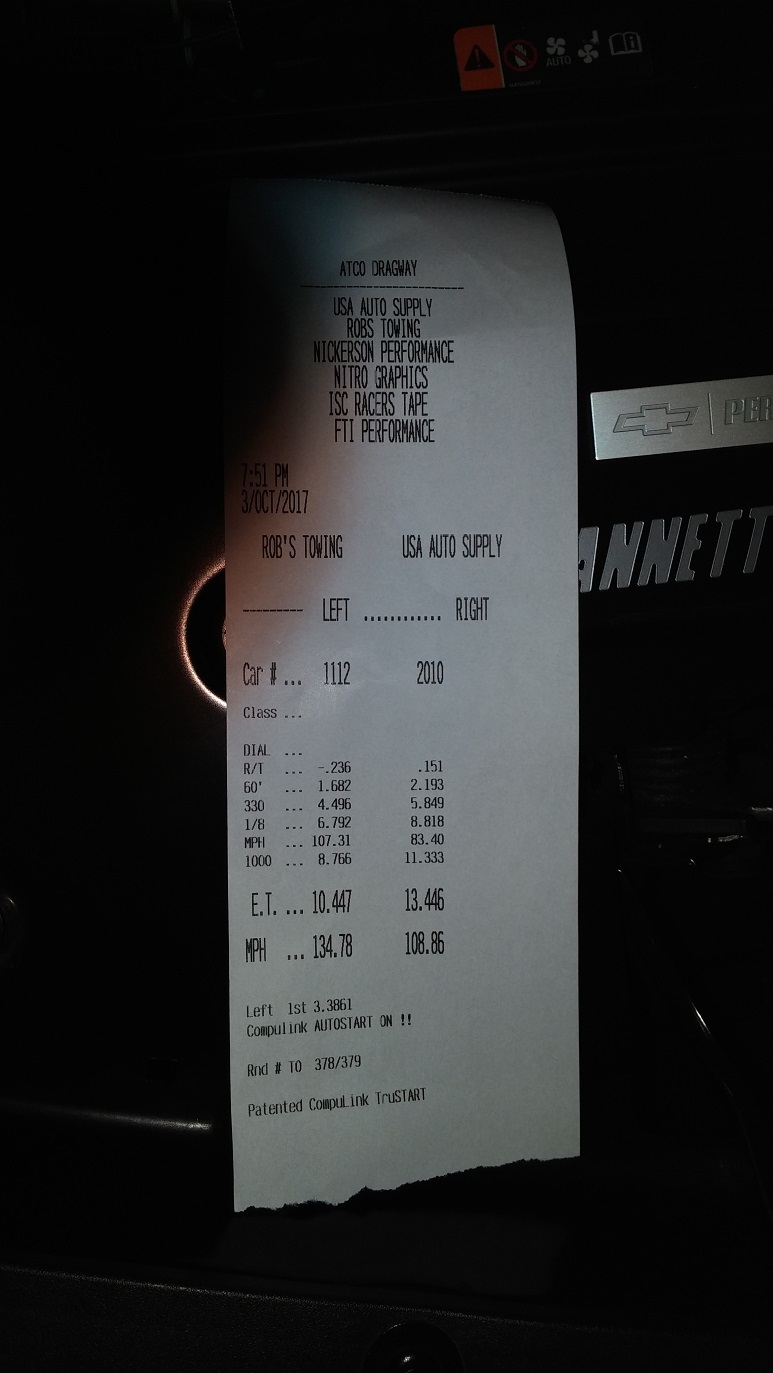 So I stayed a little later than usual and was rewarded with a little better than sea level DA. Also I got a chance to run this very nice younger guy, I think his said his name was Sean. He had a very cool looking stock blacked out 2nd gen auto CTS/V on stock tires. His last run was an 11.7 before he lined up with me. He was excited about his time until the Atco starter told him stock CTS/Vs run in the 10s. LSA CTS/Vs? LOL. Maybe LT4 CTS/Vs.