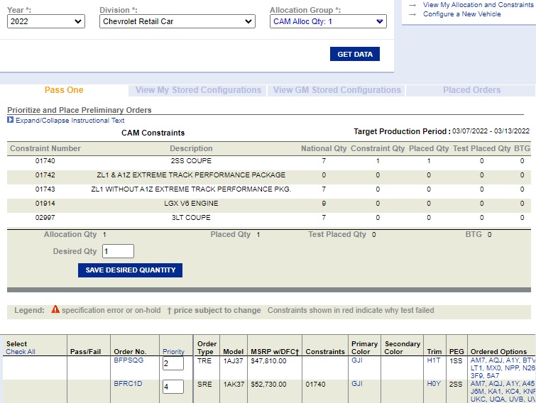 The real problem is most Dealers won't be up front with the customer about whether they have an allocation for your build or not, or how long or if they ever will get one. I have learned more about ADS/ DOSP/Constraints/4-Pass Process/Dealer Review than I ever wanted too. Just tell me (Do you have an Allocation, Yes or No). Now I'm ready to move on to a dealer that has one for 23. How you may ask ? Show me your est. Shipment report(next 60 days of Allocations), show me Final placement by week report, Show me your present preliminary order request report. There is a dealer in Detroit that has 10 22' Camaro's for sale right now. So now I'm looking locally about who has the best turn/ earn ADS for Camaro's to do my 23 order if need be or I'm heading to that dealer in Detroit, if they answer my questions to my satisfaction. 1 month to build a car, 1 month to deliver a car, OK, 3, 4, 5, 6 ,7 months for an allocation not OK.