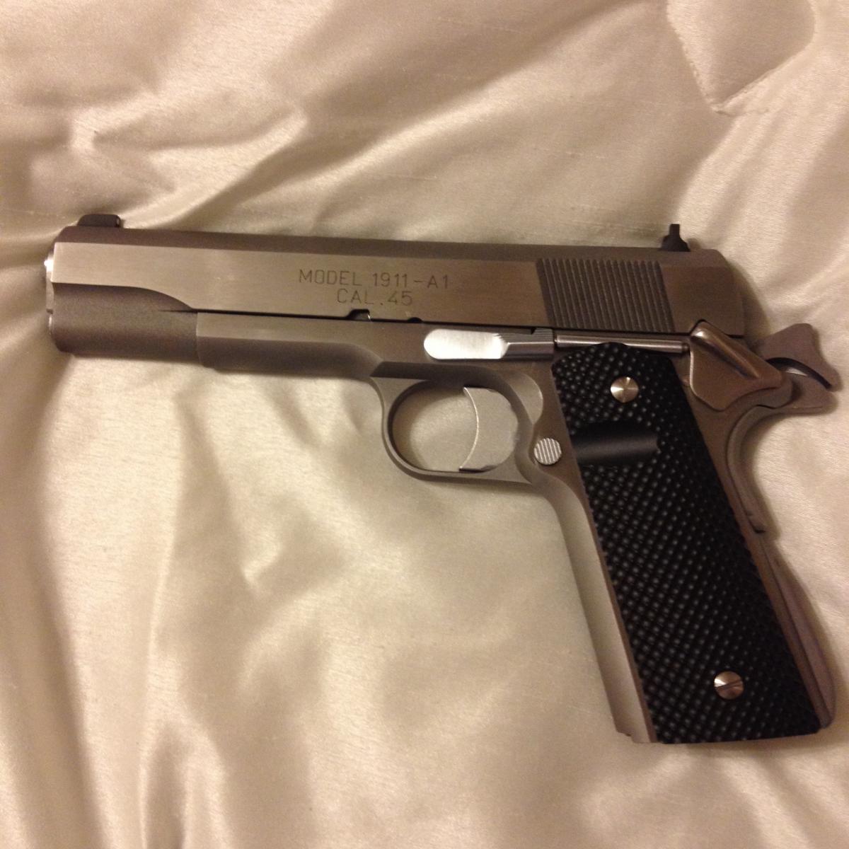 My 1978 Colt MKIV. Other side of the slide has some pits, but otherwise looks brand new. Previous owner must have stored it in the original box or somewhere moisture got trapped. A shame. I've considered sending the slide back to Colt for re-finish.