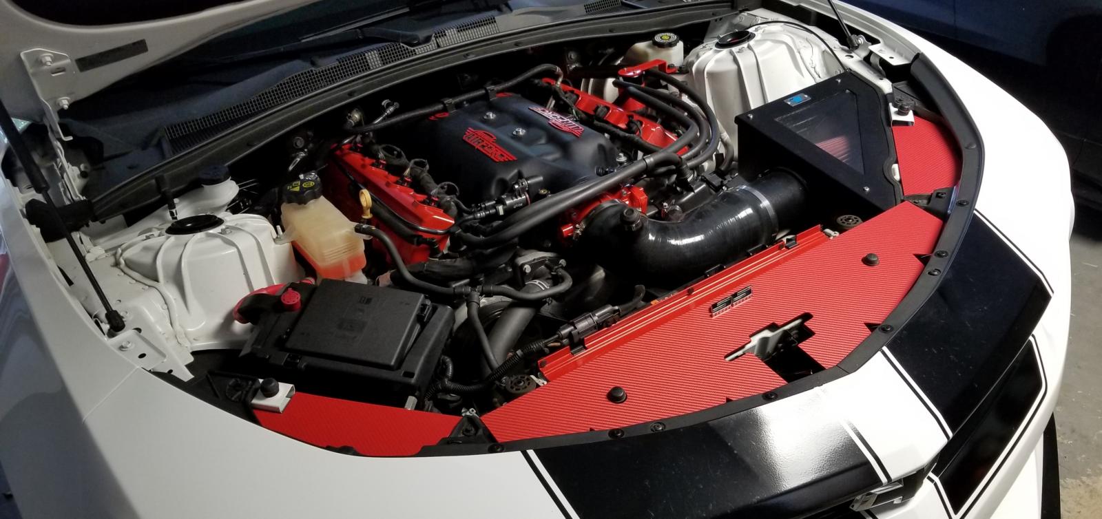 Wrapped red carbon front covers and jlt catch can.