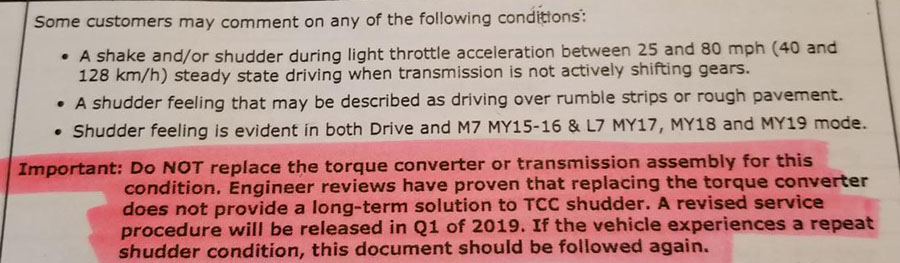 But what does the phase "& L7 MY17, MY18, and MY19 mode." mean? I have a 2018 so I am wondering the meaning of this is for 2018 models. I ask because I took my 2018 back to the dealer for shudder and they checked the codes and test drove it then told me the car is functioning as it should and that shudder is impossible for the 2018 models. Thanks |