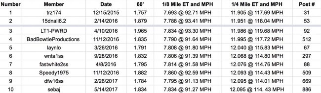 Second, That still doesn't change the fact that a tune and tire (drag radial) MY18 just ran third (the list has 2 and the times mixed) on the current ZL1 best list. If it makes you feel better, call it fourth. That's not withing spitting distance, that's quick enough to compete head to head. Hell, he made it look easy. Don't get me wrong, I'm not claiming the GT has anywhere near the ZL1 power. But it's a hell of a lot closer than I personally thought it would achieve with just a tune and wheels/tires. |