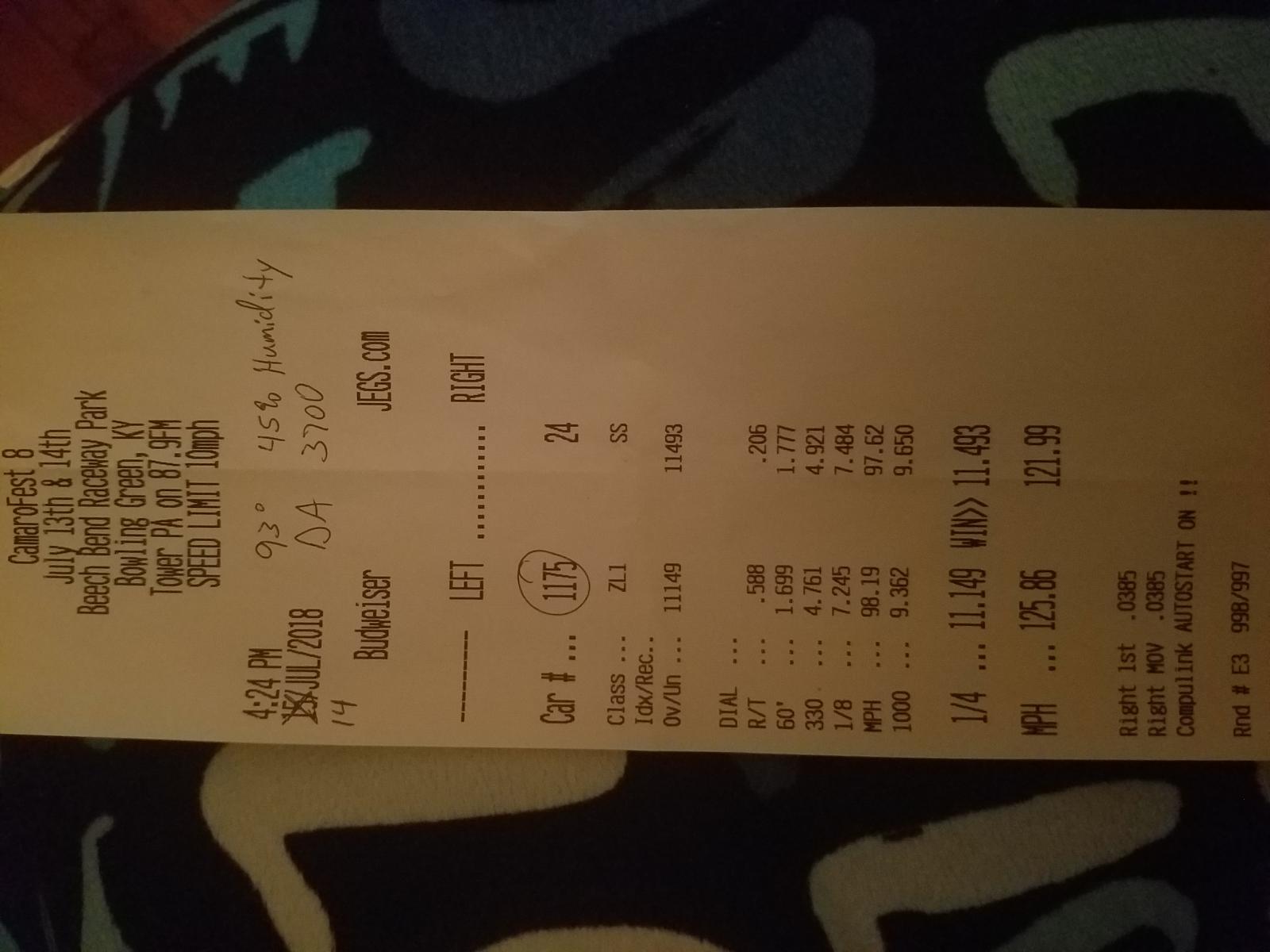 I thought maybe it was a manual, but no, it's an A10. https://www.camaro6.com/forums/showp...postcount=1495 Tires used on the pass: MT ET Street R 305/45R17 Performance Mods (if any): Lower Pulley, Headers, Cat Delete, Exhaust, CI, PT, Meth, and tires. Category submitted for: Please List the Category or Category # (8) Camaro 2017+ LT4 ZL1 Bolt On's No Internal Mod's (Stock Displacement) R/T........... .376 60'............. 1.638 330'........... 4.560 660'........... 6.956 660’ mph... 104.87 1000'.......... 9.026 1320'.......... 10.786 1320’ mph… 126.31 Name of the track: Woodburn Drag Strip Date of pass: 7.21.18 Weather conditions: Include Density Altitude if known. (Optional not required) DA 649 |