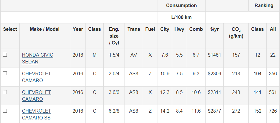 First post here. As the name suggests, long time lurker till I decided to make an account recently. I've still yet to buy my first Camaro but as a younger enthusiast with no experience regarding owning / driving Camaros (can't even get a test drive booked since they shrug me off as "another kid coming in for a joy ride"), I've been lurking here and quietly learning the important things to know about this animal before I end up committing. As 2016 draws closer to an end and as the dealers start marking down the cars, I've been getting serious about purchasing and as I was looking up the fuel consumption ratings, I was surprised to see that the 2.0T and V6 (automatic) are practically neck and neck with mileage ratings and money spent per year (ignore the Civic as I was comparing costs). Am I missing something here? Is there any benefit to going with the 2.0T VS V6 if gas mileage and costs per year on gas is a determining factor for you? I get that the numbers aren't exact as it varies per driver but are these numbers close to being the actual case or are they way off? I plan on using it as my daily driver, even through the winter so any help is greatly appreciated. |