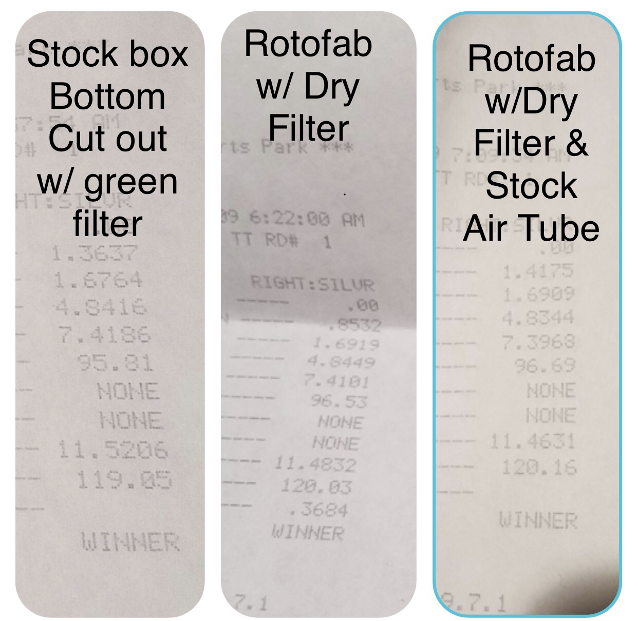 People claim that the cut box and Green filter are better than the RF. Clearly that isn't the case at the track. 1 mph is significant, especially over a modified box with a filter. The gap would have been much larger had this been a stock air box. I am not sure why the 60ft is off by .002 except for the climb in the DA but I didn't tune or drive this car. I adjusted some shift points but that was about it. All of us saw a .001-.002 rise in 60ft as the day went along so I guess it was consistent.