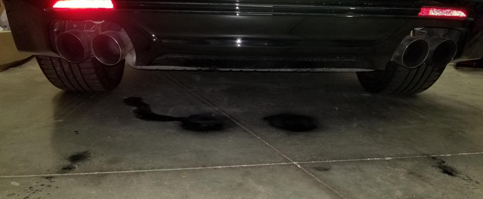 Unfortunately the black mess on the floor is normal for our cars. It's from the weep holes in the muffler letting out condensate. It also makes for a pair of lovely stains on the muffler. |