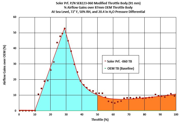 At WOT, you know how inaccurate chassis dynos can be, but we'll run back to back dynos and see what we get. Some numbers we could give right now is that your effective bore diameter goes from 87 mm (stock) to 91 mm (with mod). Our inlet/outlet design make flow much more efficient, polished to reduce skin friction, even the screws are completely out of the way. All these will show up at WOT we expect an easy 10-20+ HP gain. Some Corvettes have taken our TB's to the track, and just the smoothness and predictability makes them track worthy. Thanks, |