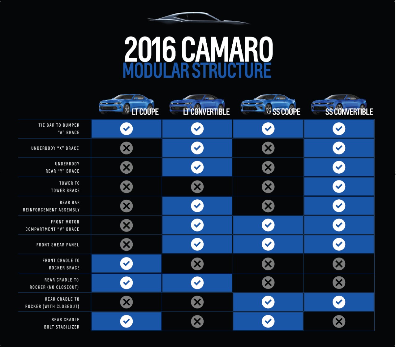 There's also different bracing on FE3 cars (compare the LT to the SS below). Other members here with V6 1LEs confirmed that their cars have at least the front shear panel added. FE2 LT cars do not. See https://www.camaro6.com/forums/showthread.php?t=561662