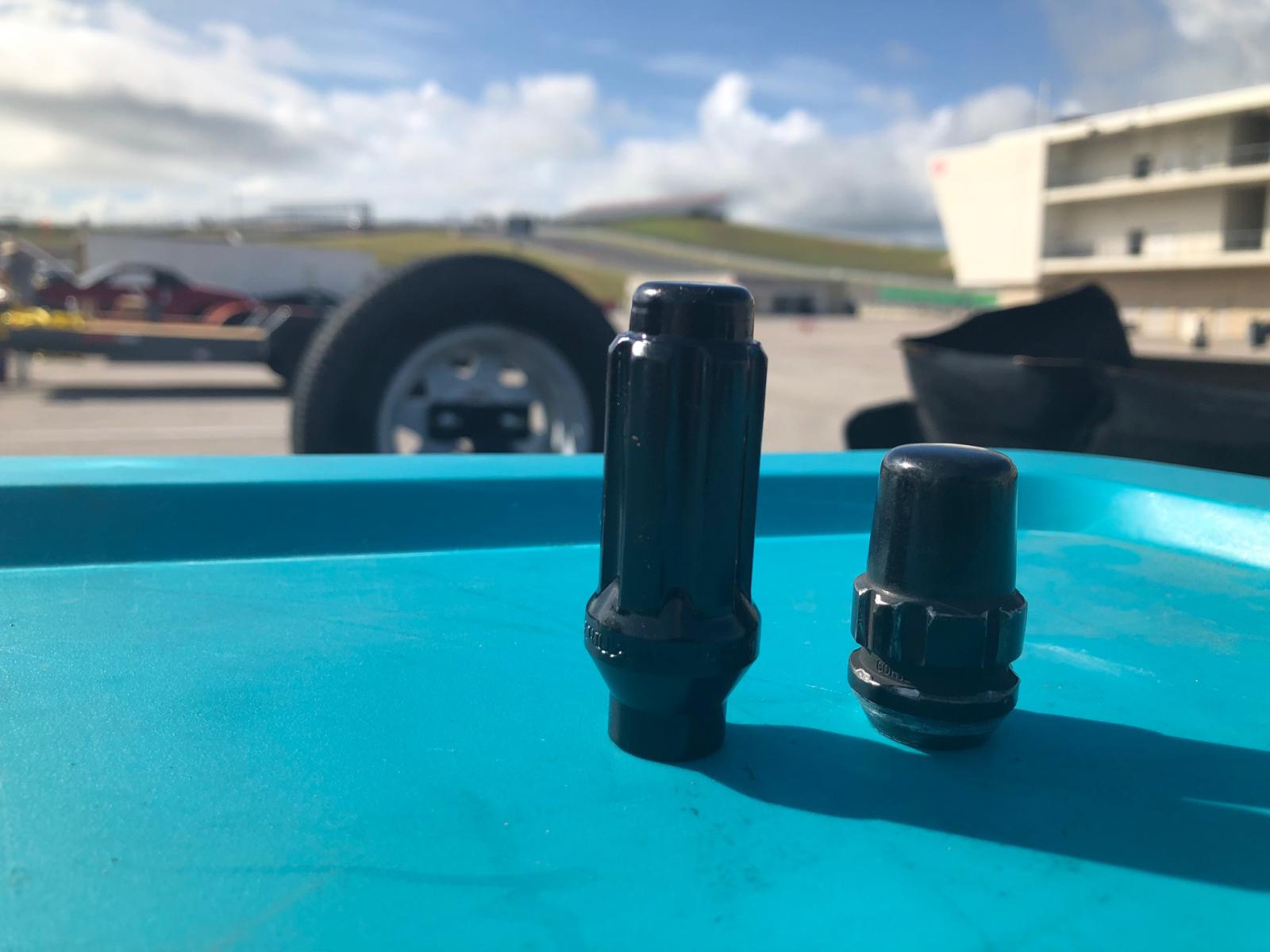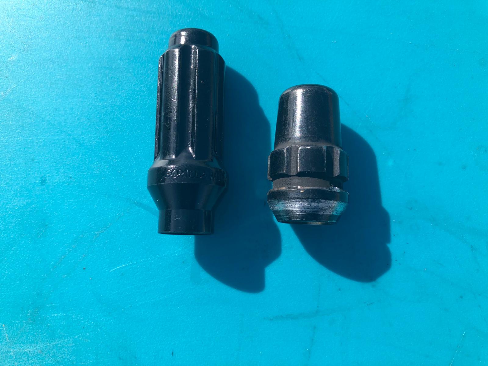 Now normally you would run extended studs to compensate for the spacer. But we we used a different lugnut that has a small sleeve that actual engages the stud from INSIDE the lugnut hole. Using the standard lugnuts (GORIILA) we could only engage the stud enough for 5 complete turns. As some of you are aware, from a safety standpoint, you want at LEAST SEVEN complete turns. With the EXTENDED lugnut which by the way would also work with extended length studs, we got about 10 turns. Problem solved. Below I have included some pics of the lug we were using compared to the new ones we are using.