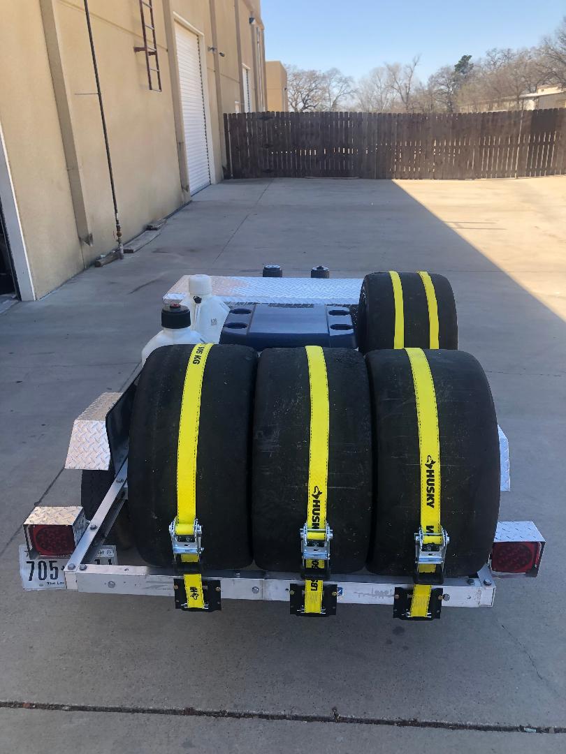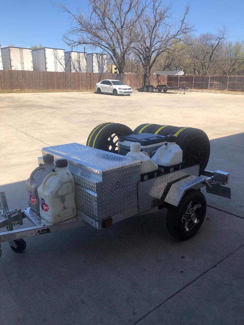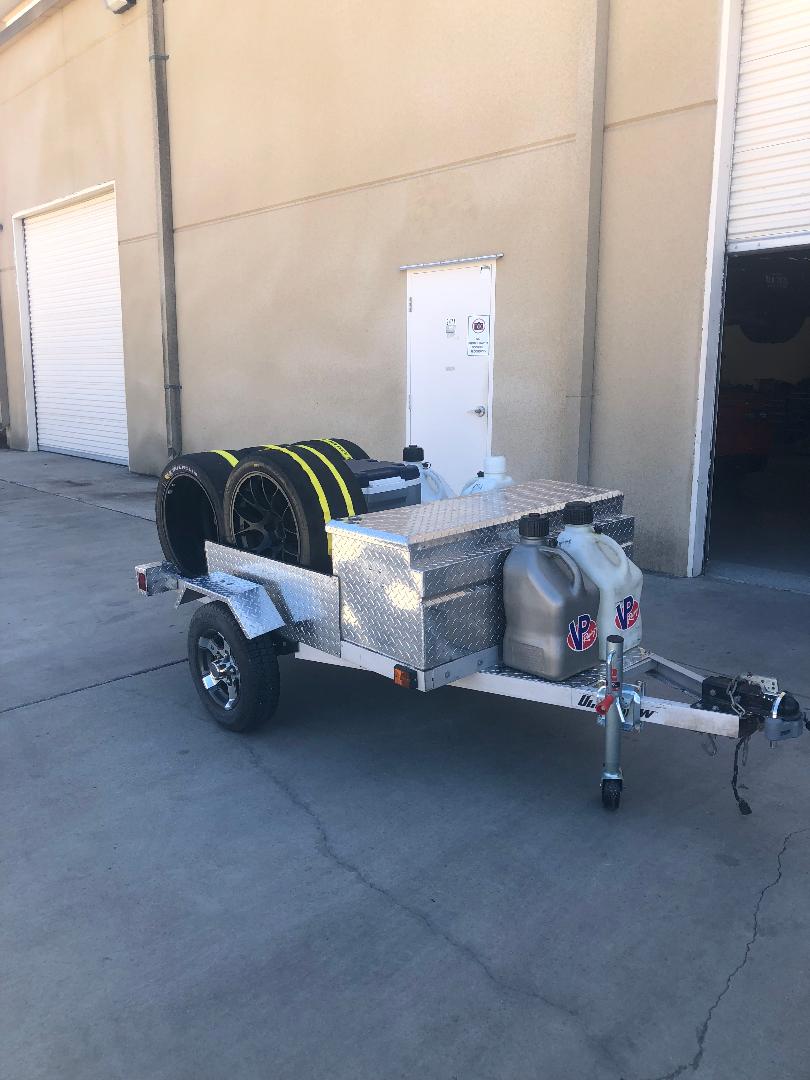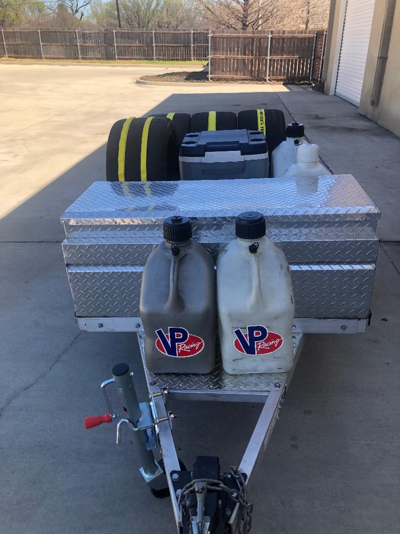 Most recently I bought a tire trailer from another track rat. When he bought it it was a northern tool 5 x 8 utility trailer but he modifed the WIDTH of it and made it about 8 inches narrower. He also double channeled some of the bracing and added some diamond plating. You will notice he installed a HUGE ICE chest and a NICE tool chest towards the FRONT of the trailer. He had two fuel bucket containers as well. Spare tire holder was added to the front of the tool box that opens up towards the BACK of the trailer. Trailer weigha ABOUT 280 pounds now. My LOADED weight will be about 800 pounds.