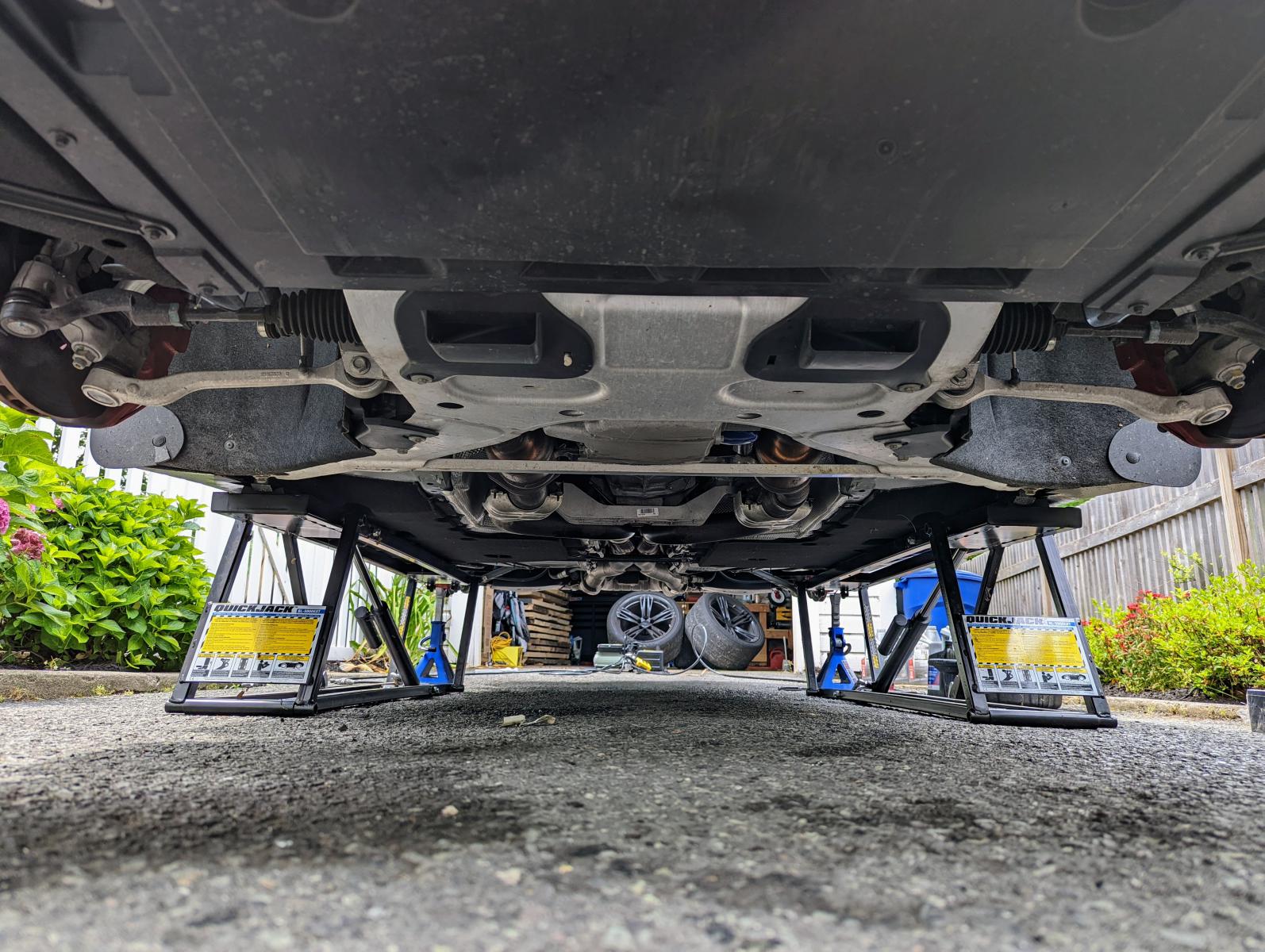 A two post lift would have also been nice (maybe nicer to be able to stand under the car?), but they take up permanent space in a garage that I didn't have room for (a 4 post would take even more, I think) and you'd be craning your neck any time you to have to look at the underside of the car. Bear in mind though that it takes a bit of time to get the lifts in a parallel position and the rubber blocks roughly centered under the pick weld lift blocks. But once it's up in the air, you can leave it up as long as you need to. |